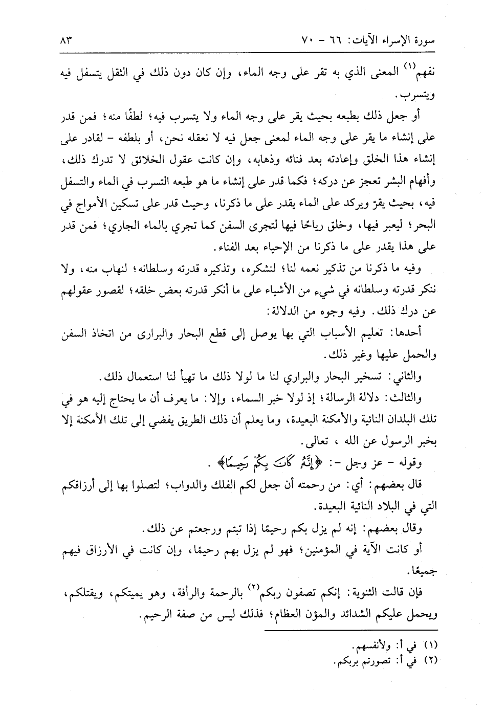 أو جعل ذلك بطبعه بحيث يقر على وجه الماء ولا يتسرب فيه؛ لطفًا منه؛ فمن قدر على إنشاء ما يقر على وجه الماء لمعنى جعل فيه لا نعقله نحن، أو بلطفه - لقادر على إنشاء هذا الخلق وإعادته بعد فنائه وذهابه، وإن كانت عقول الخلائق لا تدرك ذلك، وأفهام البشر تعجز عن دركه؛ فكما قدر على إنشاء ما هو طبعه التسرب في الماء والتسفل فيه، بحيث يقرّ ويركد على الماء يقدر على ما ذكرنا، وحيث قدر على تسكين الأمواج في البحر؛ ليعبر فيها، وخلق رياحًا فيها لتجري السفن كما تجري بالماء الجاري؛ فمن قدر على هذا يقدر على ما ذكرنا من الإحياء بعد الفناء.