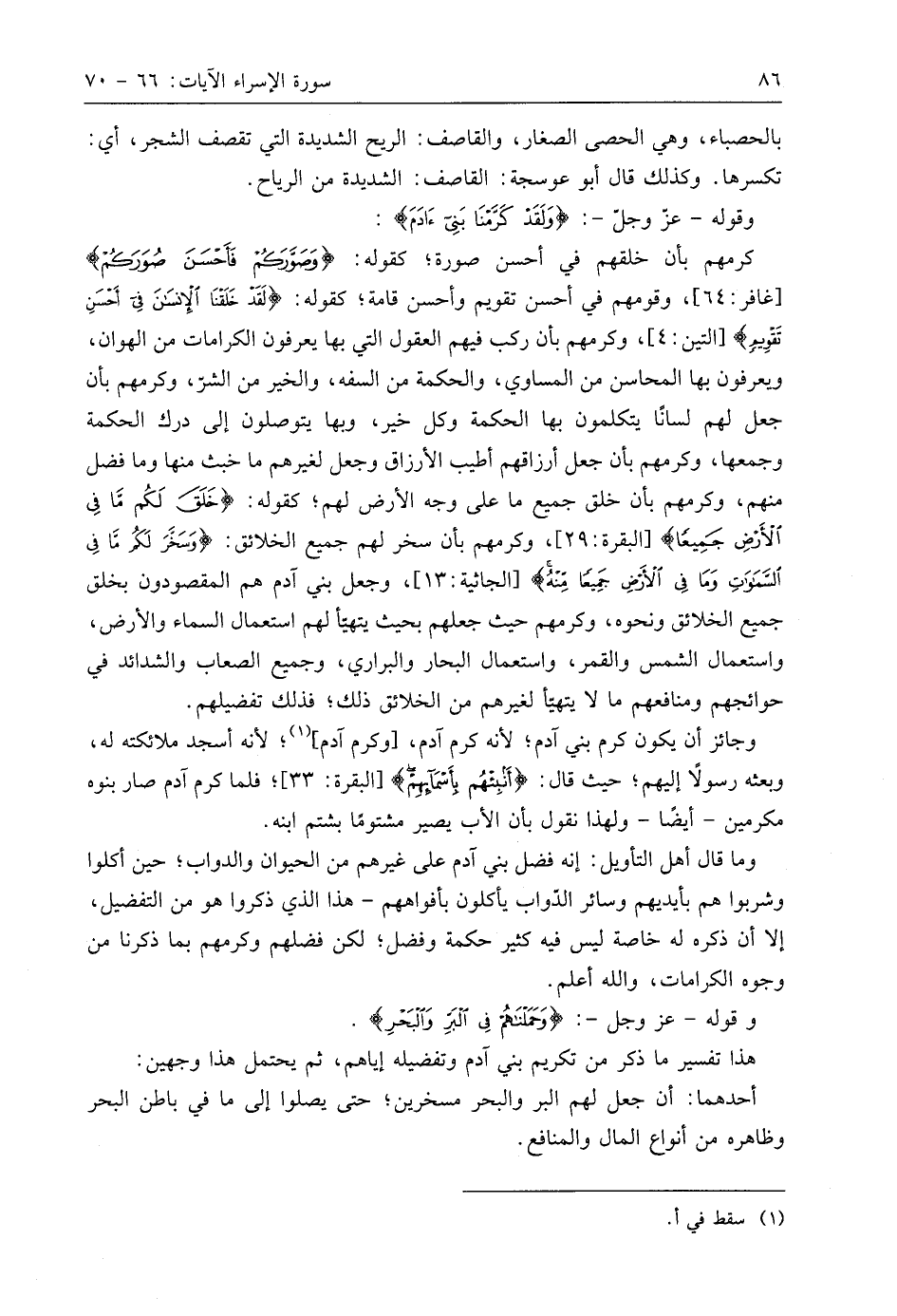 وقوله - عزّ وجلَّ -: (وَلَقَدْ كَرَّمْنَا بَنِي آدَمَ وَحَمَلْنَاهُمْ فِي الْبَرِّ وَالْبَحْرِ وَرَزَقْنَاهُمْ مِنَ الطَّيِّبَاتِ وَفَضَّلْنَاهُمْ عَلَى كَثِيرٍ مِمَّنْ خَلَقْنَا تَفْضِيلًا (70)