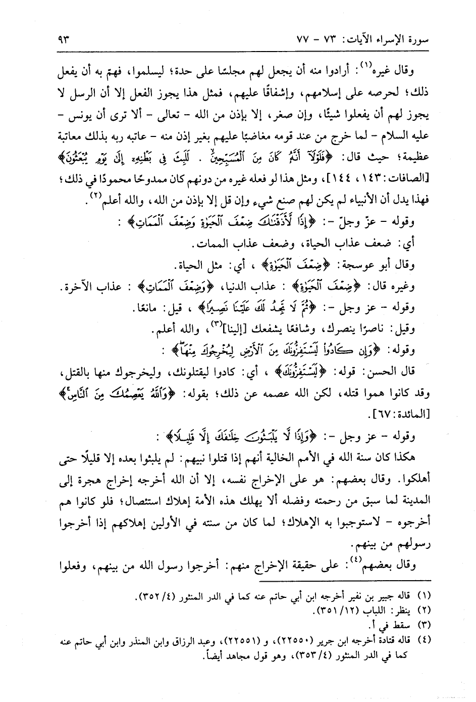 وقوله: (وَإِنْ كَادُوا لَيَسْتَفِزُّونَكَ مِنَ الْأَرْضِ لِيُخْرِجُوكَ مِنْهَا وَإِذًا لَا يَلْبَثُونَ خِلَافَكَ إِلَّا قَلِيلًا (76)
