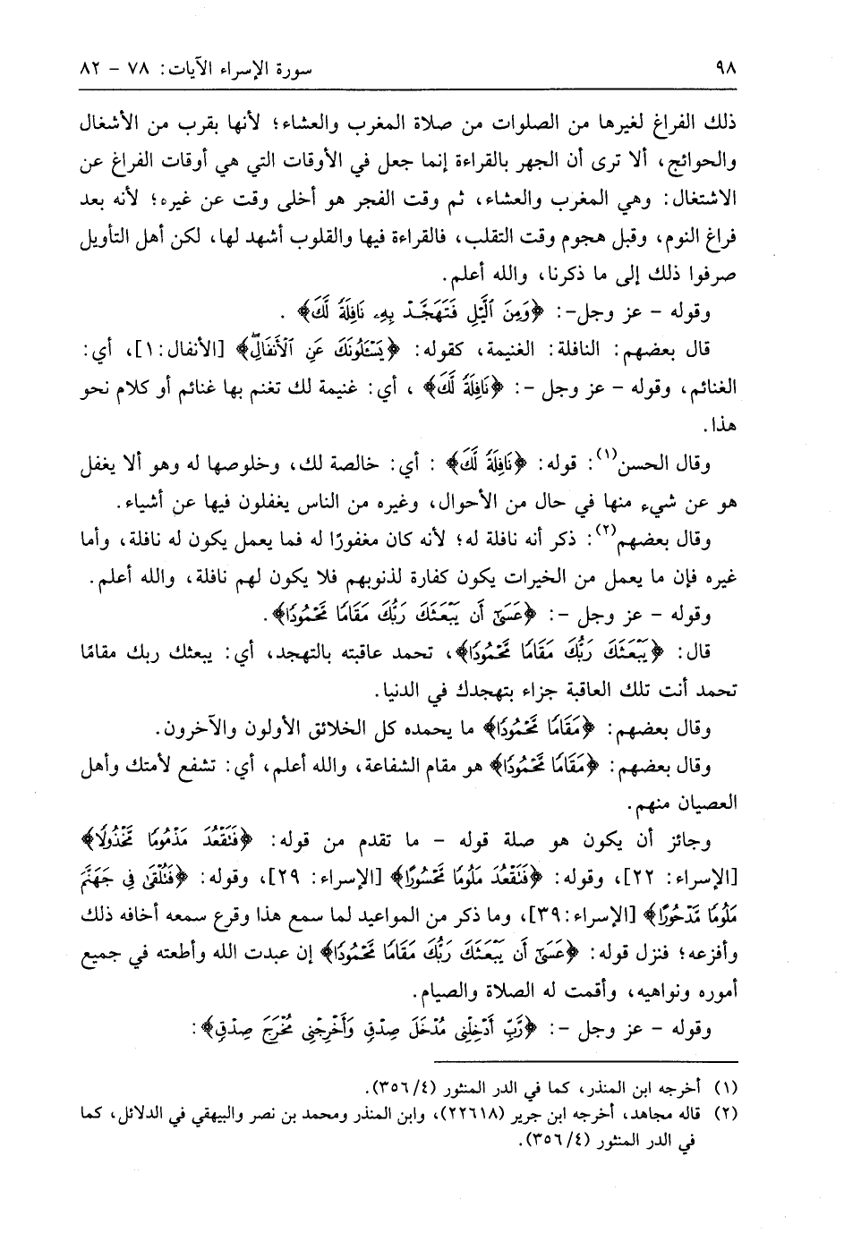 وقوله - عَزَّ وَجَلَّ -: (وَمِنَ اللَّيْلِ فَتَهَجَّدْ بِهِ نَافِلَةً لَكَ عَسَى أَنْ يَبْعَثَكَ رَبُّكَ مَقَامًا مَحْمُودًا (79)