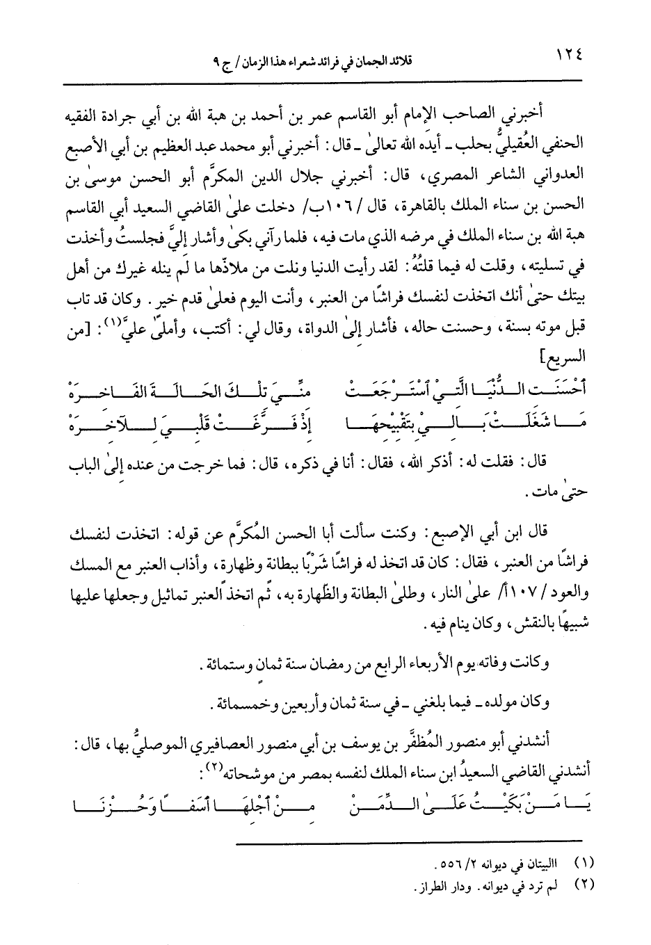 أخبرني الصاحب الإمام أبو القاسم عمر بن أحمد بن هبة الله بن أبي جرادة الفقيه الحنفي العقيليّ بحلب –أيده الله تعالى- قال: أخبرني أبو محمد عبد العظيم بن أبي الأصبع العدواني الشاعر المصري, قال: أخبرني جلال الدين المكرّم أبو الحسن موسى بن الحسن بن سناء الملك بالقاهرة, قال /106 ب/ دخلت على القاضي السعيد أبي القاسم هبة الله بن سناء الملك في مرضه الذي مات فيه, فلما رآني بكى وأشار إليّ فجلست وأخذت في تسليته, وقلت له فيما قلته: لقد رأيت الدنيا ونلت من ملاذّها ما لم ينله غيرك من أهل بيتك حتى أنك اتخذت لنفسك فراشا من العنبر, وأنت اليوم فعلى قدم خير. وكان قد تاب قبل موته بسنة, وحسنت حاله, فأشار إلى الدواة, مقال لي: كتب, وأملى على (1): [من المسرع]