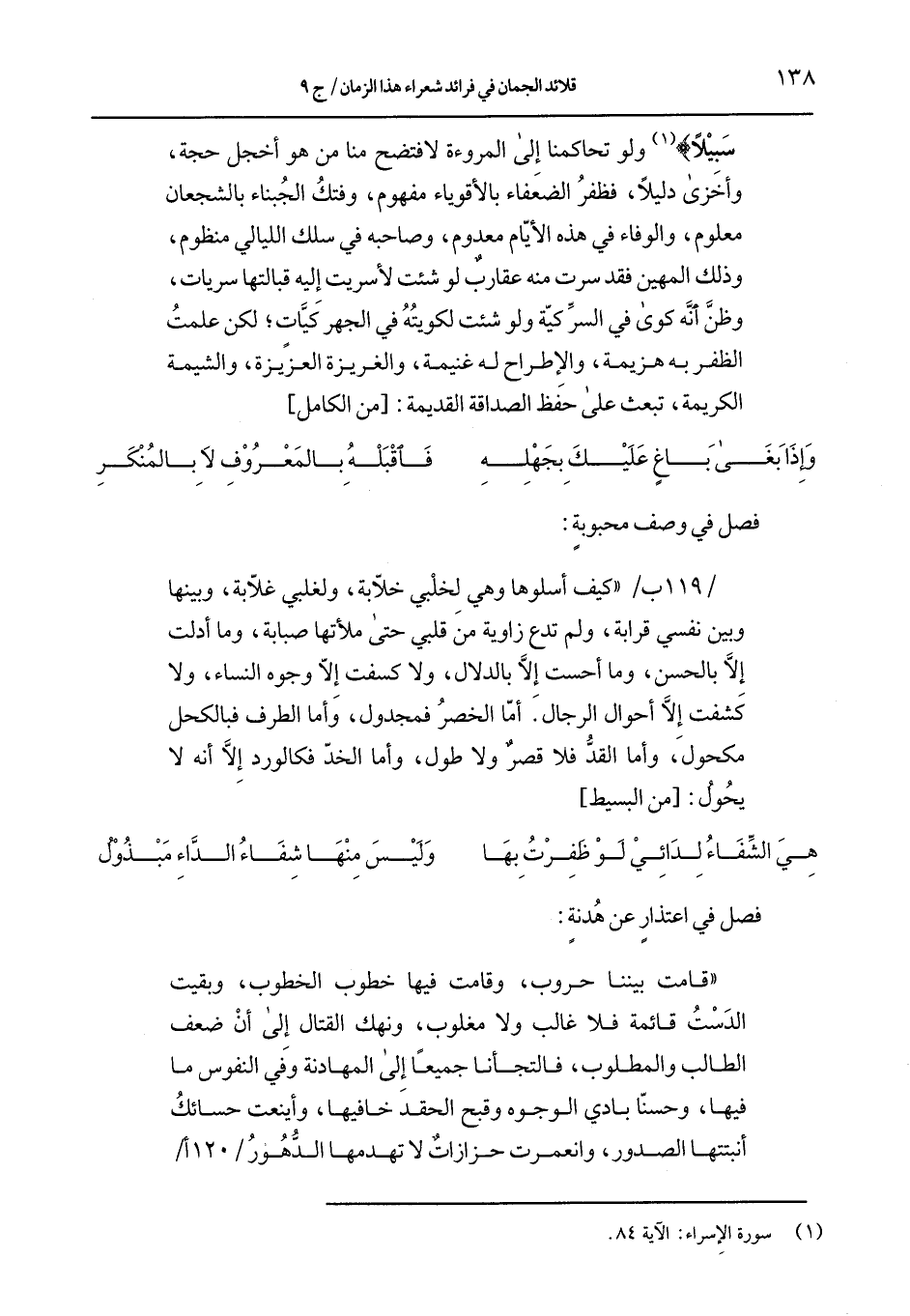سبيلا} ولوتحاكمنا إلى المروءة لا فتضح منا من هو أخجل حجة, وأخزى دليلا, فظفر الضعفاء بالأقوياء مفهوم, فتك الجبناء بالشجعان معلوم, والوفاء في هذه الأيام معدوم, وصاحبه في سلك الليالي منظوم, وذلك المهين فقد سرت منه عقارب لو شئت لأسريت إليه قبالتها سريات, وطن أنه كوى في السر كية ولو شئت لكويته في الجهر كيّات, ولكن علمت الظفر به هزيمة, والإطراح له غنيمة, والغريزة العزيزة, والشيمة الكريمة تبعث على حفظ الصداقة القديمة: [من الكامل]
