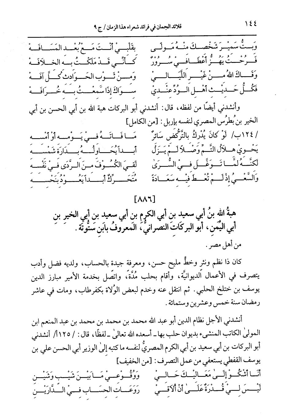 أنشدني الأجل نظام الدين أبو عبد الله محمد بن محمد بن محمد بن عبد المنعم ابن المولى الكاتب المنشيء بديوان حلب بها –أسعده الله تعالى- لفظا, قال: /125 أ/ أنشدني أبو البركات بن ابي سعيد بن ابي الكرم المصري لنفسه ما كتبه إلى الوزير أبي الحسن علي بن يوسف القفطي يستعفي من عمل التصرف: [من الخفيف]
