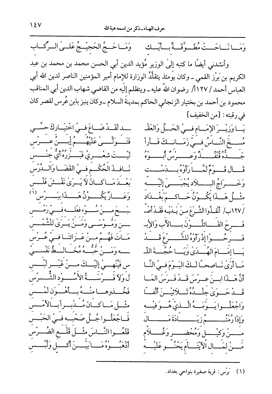 بن برز القمى- وكان يومئذ يتقلد الوزارة للإمام أمير المؤمنين الناصر لدين الله أبى العباس /127 أ/ رضوان الله عليه-ويتظلم إليه من القاضي شهاب الدين أبى المناقب