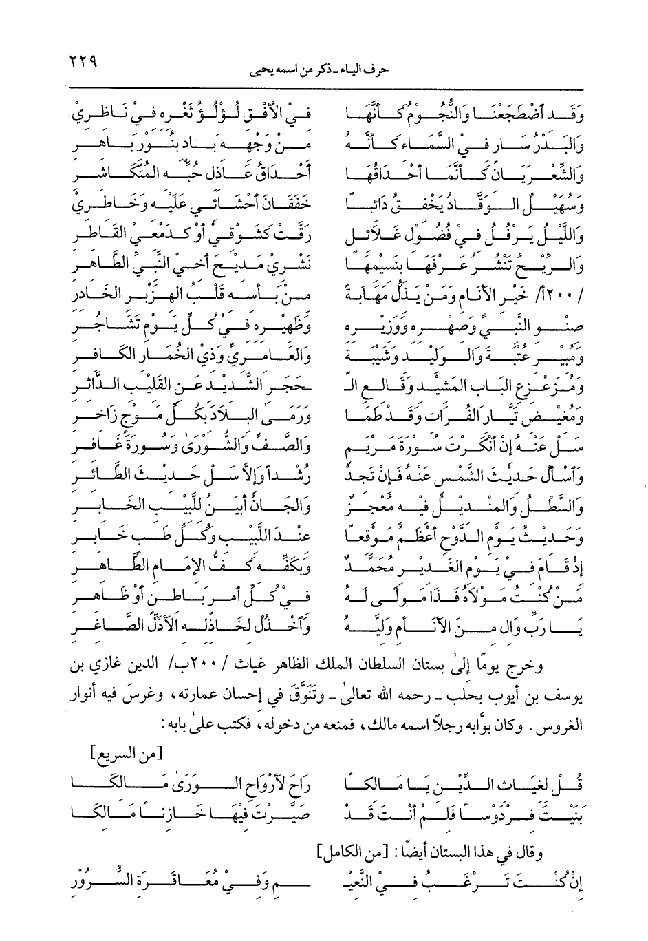 وخرج يوماً إلى بستان السلطان الملك الظاهر غياث / 200 ب/ الدين غازي بن يوسف بن أيوب بحلب - رحمة الله تعالى - وتنوَّق في إحسان عمارته، وغرس فيه أنوار الغروس. وكان بَّوابة رجلاً اسمه مالك، فمنعه من دخوله، فكتب على بابه:
