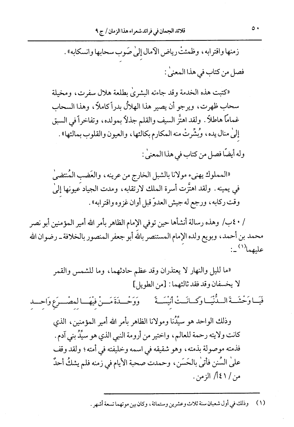 /40 ب/ وهذه رسالة أنشأها حين توفي الإمام الظاهر بأمر الله أمير المؤمنين أبو نمصر محمد بن أحمد، وبويع ولده المستنصر بالله أبو جعفر المنصور بالخلافة- رضوان الله عليهما (! ) -: