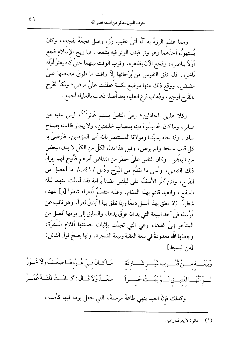 وكلا هذين الحادثين، رمى الناس بسهم عائر (1)، ليس عليه من صابر، وما كان الله ليسوء دينه بمصاب خليفتين، ولا يجلو ظلمته بصباح سافر. وقد جاء بسيدنا ومولانا المستنصر بالله أمير المؤمنين، فأرضى به كل قلب سخط ولم يرض، وقيل هذا بدل الكلّ من الكلّ لا بدل البعض من البعض. وكان الناس على خطر من انتقاض أمرهم فأتيح لهم إبرامذلك النقض، ونسى ما تقدّم من البرح ودمل /41 ب/ وما أعضل من القرح، وإن كثر الأسف على ليلتين مضتا برامة فقد أسلت عنهما ليلة السفح، والعبد قائم بهذا المقام، وقلبه متقسم للعزاء شطرا [و] للهناء شطرا. فإذا نطق بهذا أسبل دمعا وإذا نطق بهذا أبدى ثغرا، وهو نائب عن مرسله في أخذ البيعة التي يد الله فوقها، والسابق إلى يومها أفضل من المتأخر إلى غدها، وهي التي تجلّت بإثبات حسنتها أقلام السّفرة، وجعلها الله معدودة في بيعة العقبة وبيعة الشجرة. ولها يصح قول القائل: