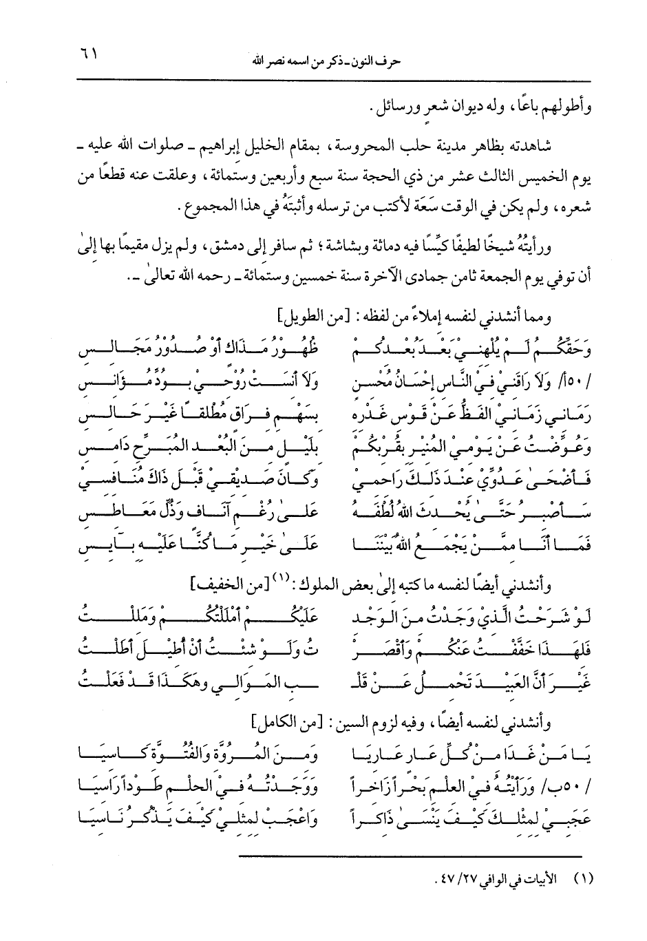وأطولهم باعا، بظاهر مدينة حلب المحروسة، بمقام الخليل إبراهيم – صلوات الله عليه- يوم الخميس الثالث عشر من ذي الحجة سنة سبع وأربعين وستمائة، وعلقت عنه قطعا من شعره، ولم يكن في الوقت سعة لأكتب من ترسله وأثبته في هذا المجموع.