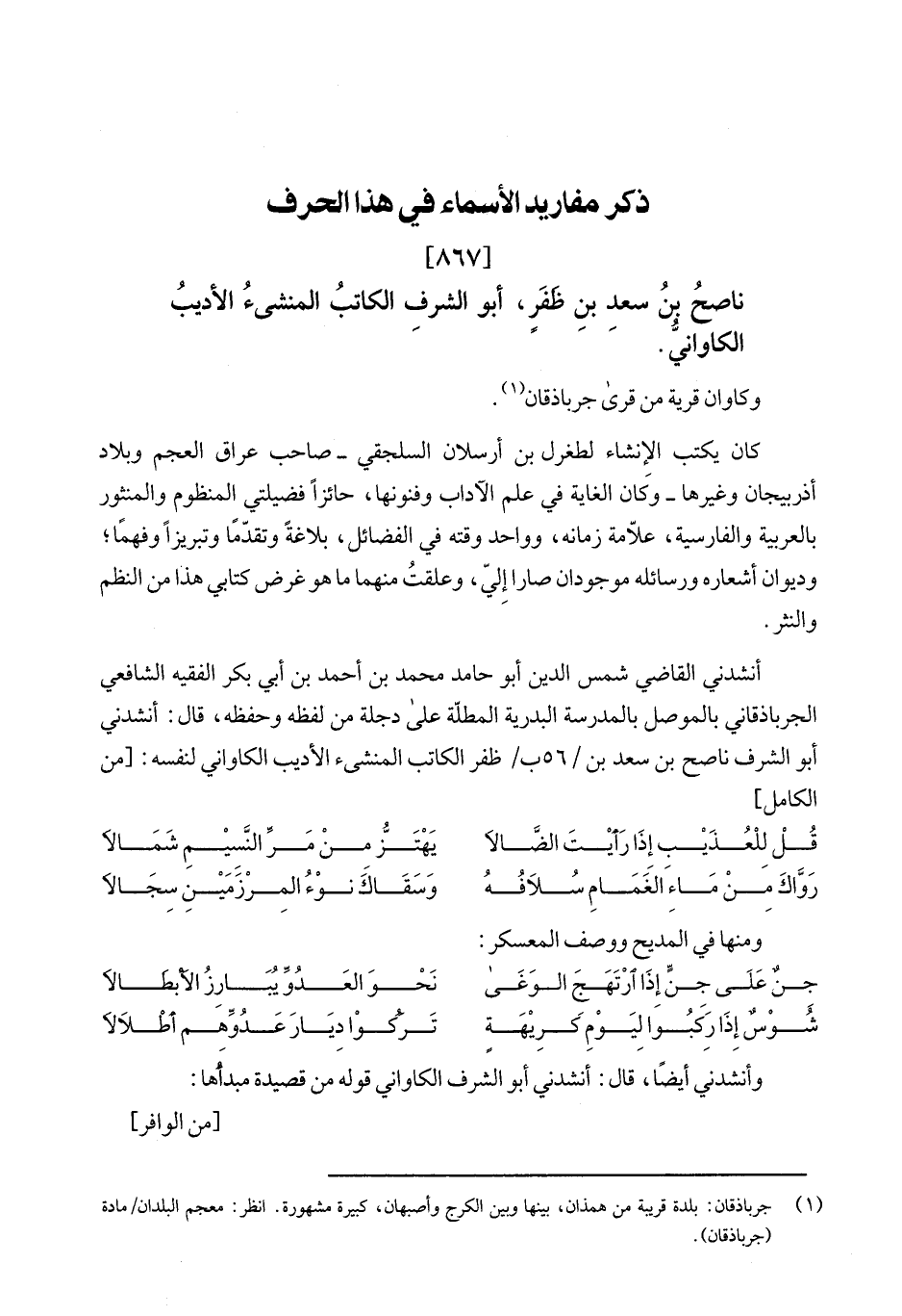 أنشدني القاضي شمي الدين أبو حامد محمد بن احمد بن ابي بكر الفقيه الشافعي الجربذقاني بالموصل بالمدرسة البدرية المطّلة على دجلة من لفظه وحفظه، قال: انشدني أبو الشرف ناصع بن سعد بن /56 ب/ظفر الكاتب المنشئ الأديب الكاواني لنفسه: [من الكامل]