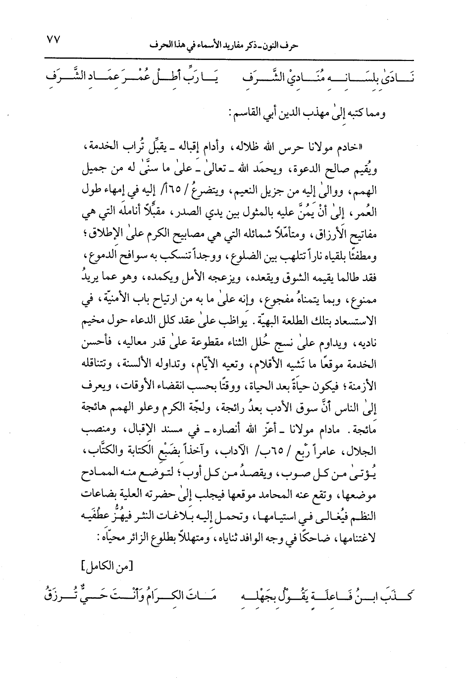 " خادم مولانا مولانا حرس الله ظلاله، وأدام إقباله – يقبّل تراب الخدمة، ويقيم صالح الدعوة، ويحمد الله – تعالى- على ما سنّي له من جميل الهمم، ووالى إليه من جزيل النعيم، ويتضرع /65 أ/ إليه في إمهاء طول العمر، إلى أن يمنّ عليه بالمثول بين يدي الصدر، مقبّلا أنامله التي هي مفاتيح الأرزاق، ومتأمّلا شمائله التي هي مفاتيح الكرم على الإطلاق، ومطفئا بلقياه نارا تتلهب بين الضلوع، ووجدا تنسكب به سوافح الدموع، فقد طالما يقيمه الشوق ويقعده، ويزعجه الأمل ويكمده، وهو عما يريد ممنوع، وبما يتمناه مفجوع، وإنه على ما به من ارتياح باب الأمنية، في الاستسعاد بتلك الطلعة البهية. يواظب على عقد كلل الدعاء حول مخيم ناديه، ويداوم على نسج حلل الثناء مقطوعة على قدر معاليه، فاحسن الخدمة موقعا ما تشيه الأقلام، وتعيه الأيام، وتداوله الألسنة، وتتناقله الأزمنة، فيكون حياة بعد الحياة، ووقتا بحسب إنقضاء الأوقات، ويعرف إلى النّاس أنّ سوق الأدب بعد رائجة، ولجة الكرم وعلو الهمم هائجة مائجة. ما دام مولانا – أعز الله أنصاره – في مسند الإقبال، ومنصب الجلال، عامرا ربع /65 ب/ الآداب، وآخذا بضبع الكتابة والكتّاب، يؤتى من كل صوب، ويقصد من كل أوب، لتوضع منه الممادح موضعها، وتقع عنه المحامد موقعها فيجلب إلى حضرته العلية بضاعات النظم فيغالي في استيامها، ويجعل إليه بلاغات النثر فيهزّ عطفيه لاغتنامها، ضاحكا في وجه الوافد ثناياه، ومتهللا بطلوع الزائر محياه: [من الكامل]