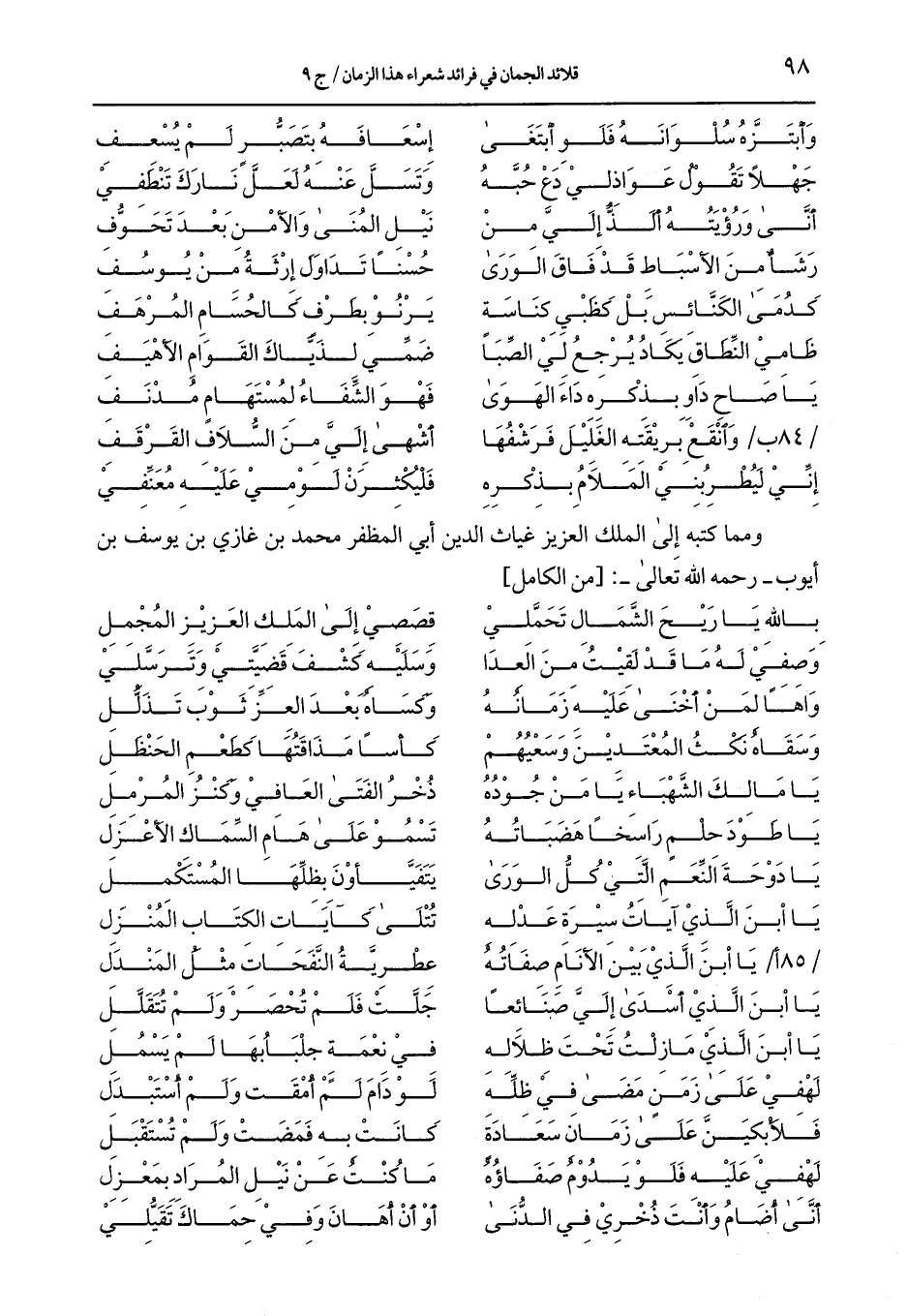 ومما كتبه إلى الملك العزيز غياث الدين أبي المظفر محمد بن غازي بن يوسف بن أيوب – رحمه الله تعالى -: [من الكامل]