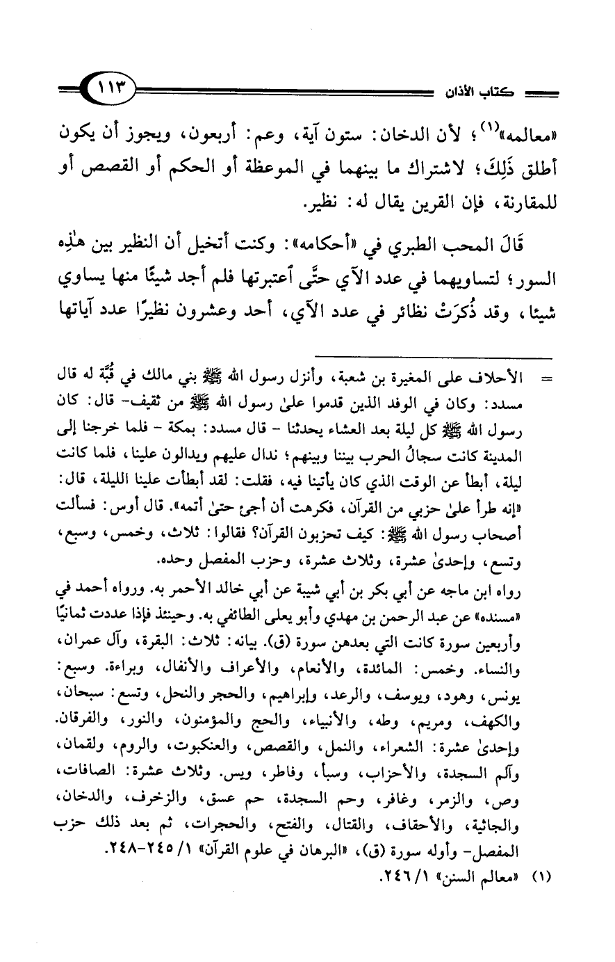 "معالمه" (¬1)؛ لأن الدخان: ستون آية، وعم: أربعون، ويجوز أن يكون أطلق ذَلِكَ، لاشتراك ما بينهما في الموعظة أو الحكم أو القصص أو للمقارنة، فإن القرين يقال له: نظير.
