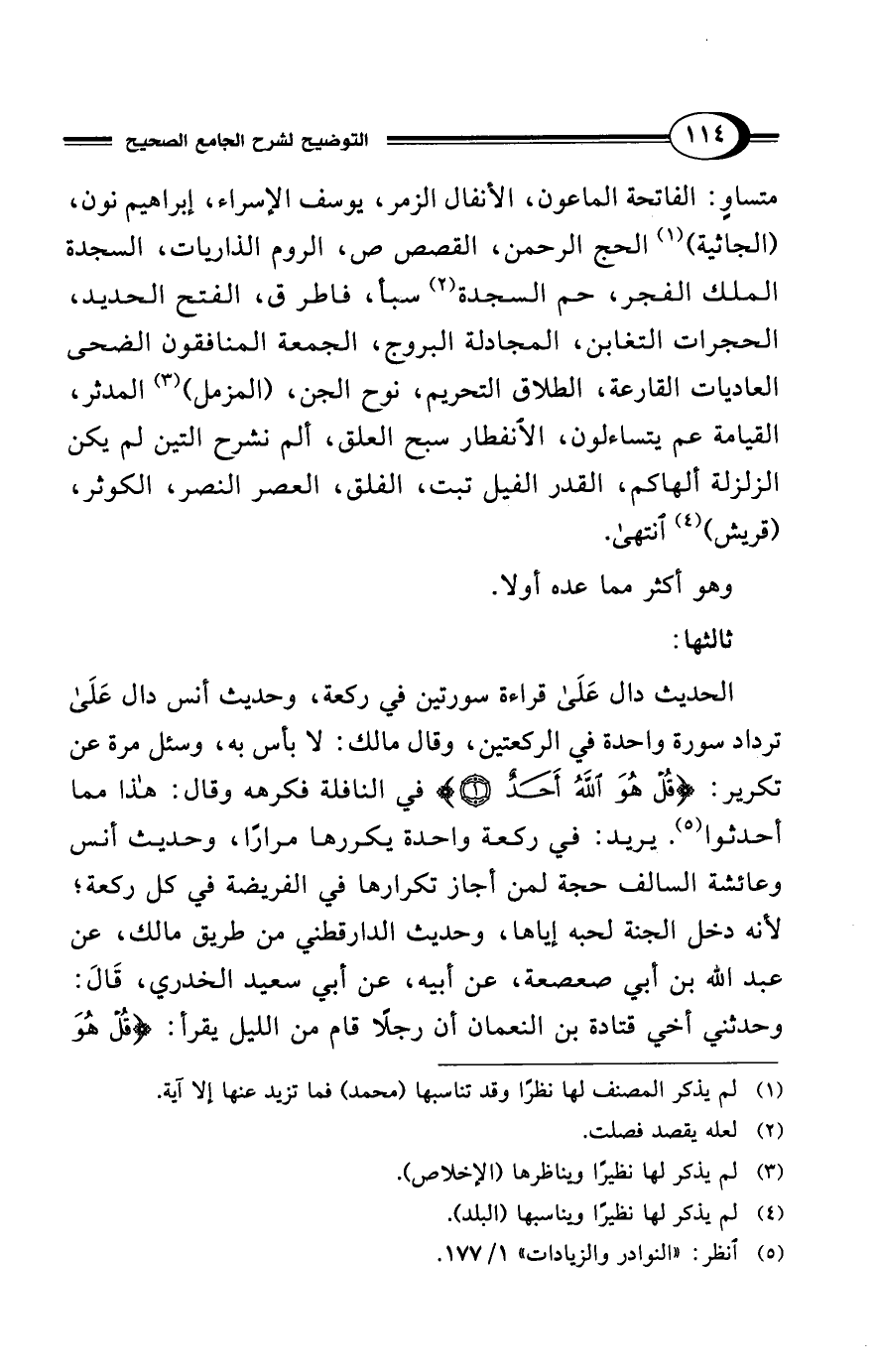متساوٍ: الفاتحة الماعون، الأنفال الزمر، يوسف الإسراء، إبراهيم نون، (الجاثية) (¬1) الحج الرحمن، القصص ص، الروم الذاريات، السجدة الملك الفجر، حم السجدة (¬2) سبأ، فاطر ق، الفتح الحديد، الحجرات التغابن، المجادلة البروج، الجمعة المنافقون الضحى العاديات القارعة، الطلاق التحريم، نوح الجن، (المزمل) (¬3) المدثر، القيامة عم يتساءلون، الانفطار سبح العلق، ألم نشرح التين لم يكن الزلزلة ألهاكم، القدر الفيل تبت، الفلق، العصر النصر، الكوثر، (قريش) (¬4) انتهى.