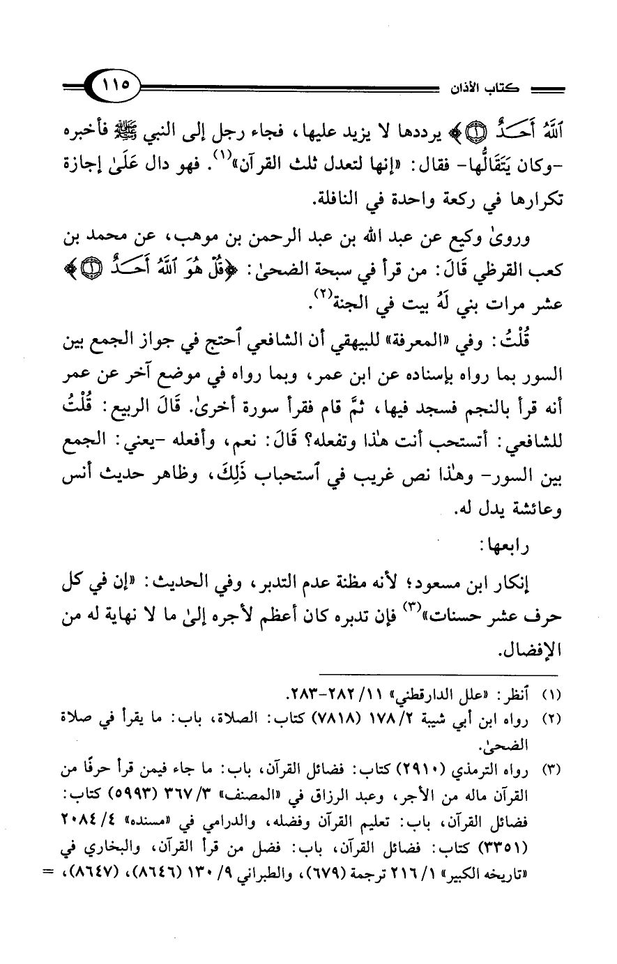 اللهُ أَحَدٌ (1)} يرددها لا يزيد عليها، فجاء رجل إلى النبي - صلى الله عليه وسلم - فأخبره - وكان يَتَقَالُّها- فقال: "إنها لتعدل ثلث القرآن" (¬1). فهو دال عَلَى إجازة تكرارها في ركعة واحدة في النافلة.