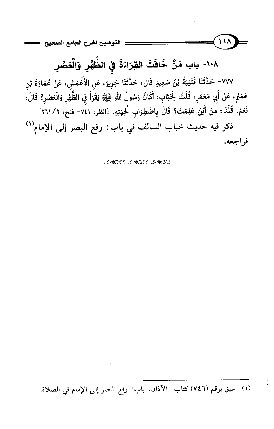 777 - حَدَّثَنَا قُتَيْبَةُ بْنُ سَعِيدٍ قَالَ: حَدَّثَنَا جَرِيرٌ، عَنِ الأَعْمَشِ، عَنْ عُمَارَةَ بْنِ عُمَيْرٍ، عَنْ أَبِي مَعْمَرٍ: قُلْتُ لِخَبَّابٍ: أَكَانَ رَسُولُ اللهِ - صلى الله عليه وسلم - يَقْرَأُ فِي الظُّهْرِ وَالْعَصْرِ؟ قَالَ نَعَمْ. قُلْنَا مِنْ أَيْنَ عَلِمْتَ؟ قَالَ بِاضْطِرَابِ لِحْيَتِهِ. [انظر: 746 - فتح: 2/ 261]