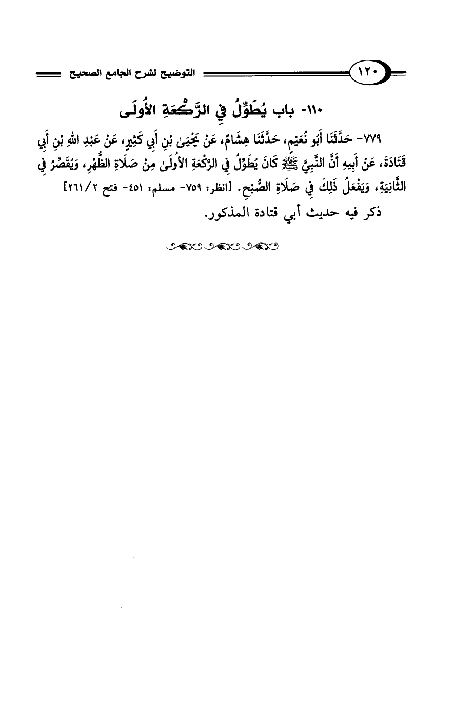 779 - حَدَّثَنَا أَبُو نُعَيْمٍ، حَدَّثَنَا هِشَامٌ، عَنْ يَحْيَى بْنِ أَبِي كَثِيرٍ، عَنْ عَبْدِ اللهِ بْنِ أَبِي قَتَادَةَ، عَنْ أَبِيهِ أَنَّ النَّبِيَّ - صلى الله عليه وسلم - كَانَ يُطَوِّلُ فِي الرَّكْعَةِ الأُولَى مِنْ صَلاَةِ الظُّهْرِ، وَيُقَصِّرُ فِي الثَّانِيَةِ، وَيَفْعَلُ ذَلِكَ فِي صَلاَةِ الصُّبْحِ. [انظر: 759 - مسلم: 451 - فتح 2/ 261]