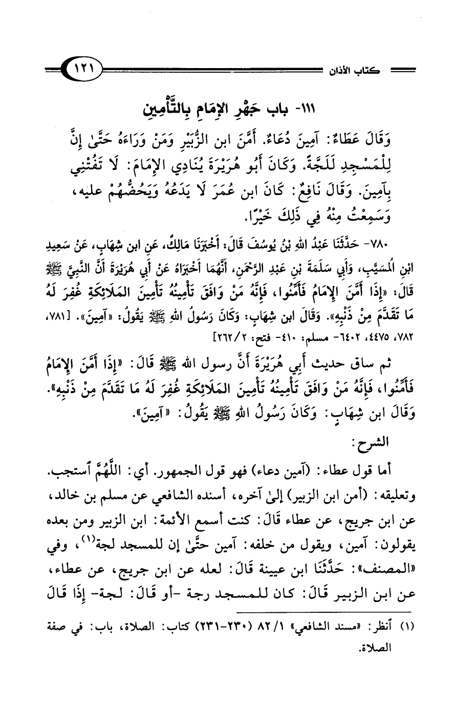 ثم ساق حديث أَبِي هُرَيْرَةَ أَنَّ رسول الله - صلى الله عليه وسلم - قَالَ: "إِذَا أَمَّنَ الإِمَامُ فَأمِّنُوا، فَإِنَّهُ مَنْ وَافَقَ تَأْمِينُهُ تَأْمِينَ المَلَائِكَةِ غُفِرَ لَهُ مَا تَقَدَّمَ مِنْ ذَنْبِهِ". وَقَالَ ابن شِهَابٍ: وَكَانَ رَسُولُ اللهِ - صلى الله عليه وسلم - يَقُولُ: "آمِينَ".