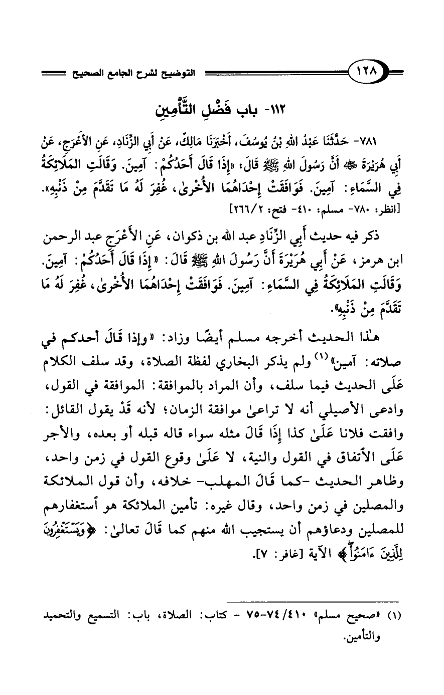 781 - حَدَّثَنَا عَبْدُ اللهِ بْنُ يُوسُفَ، أَخْبَرَنَا مَالِكٌ، عَنْ أَبِي الزِّنَادِ، عَنِ الأَعْرَجِ، عَنْ أَبِي هُرَيْرَةَ - رضى الله عنه - أَنَّ رَسُولَ اللهِ - صلى الله عليه وسلم - قَالَ: "إِذَا قَالَ أَحَدُكُمْ: آمِينَ. وَقَالَتِ الْمَلاَئِكَةُ فِي السَّمَاءِ: آمِينَ. فَوَافَقَتْ إِحْدَاهُمَا الأُخْرَى، غُفِرَ لَهُ مَا تَقَدَّمَ مِنْ ذَنْبِهِ". [انظر: 780 - مسلم: 410 - فتح: 2/ 266]