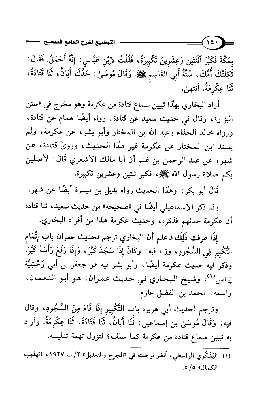 بِمَكَّةَ فَكَبَّرَ اثْنَتَين وَعِشْرِينَ تَكْبِيرَةً، فَقُلْتُ لاِبْنِ عَبَّاسٍ: إِنَّهُ أَحْمَقُ. فَقَالَ: ثَكِلَتْكَ أُمُّكَ، سُنَّةُ أَبِي القَاسِمِ - صلى الله عليه وسلم -. وَقَالَ مُوسَى: حَدَّثنَا أَبَانُ، ثَنَا قَتَادَة، ثَنَا عِكْرِمَةُ. انتهى.