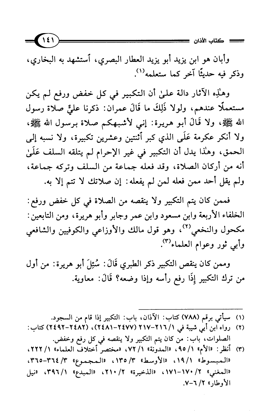 وهذِه الآثار دالة على أن التكبير في كل خفض ورفع لم يكن مستعملًا عندهم، ولولا ذَلِكَ ما قَالَ عمران: ذكرنا عليٌّ صلاة رسول الله - صلى الله عليه وسلم -، ولا قَالَ أبو هريرة: إني لأشبهكم صلاة برسول الله - صلى الله عليه وسلم -، ولا أنكر عكرمة عَلَى الذي كبر اثنتين وعشرين تكبيرة، ولا نسبه إلى الحمق، وهذا يدل أن التكبير في غير الإحرام لم يتلقه السلف عَلَى أنه من أركان الصلاة، وقد فعله جماعة من السلف وتركه جماعة، ولم يقل أحد ممن فعله لمن لم يفعله: إن صلاتك لا تتم إلا به.