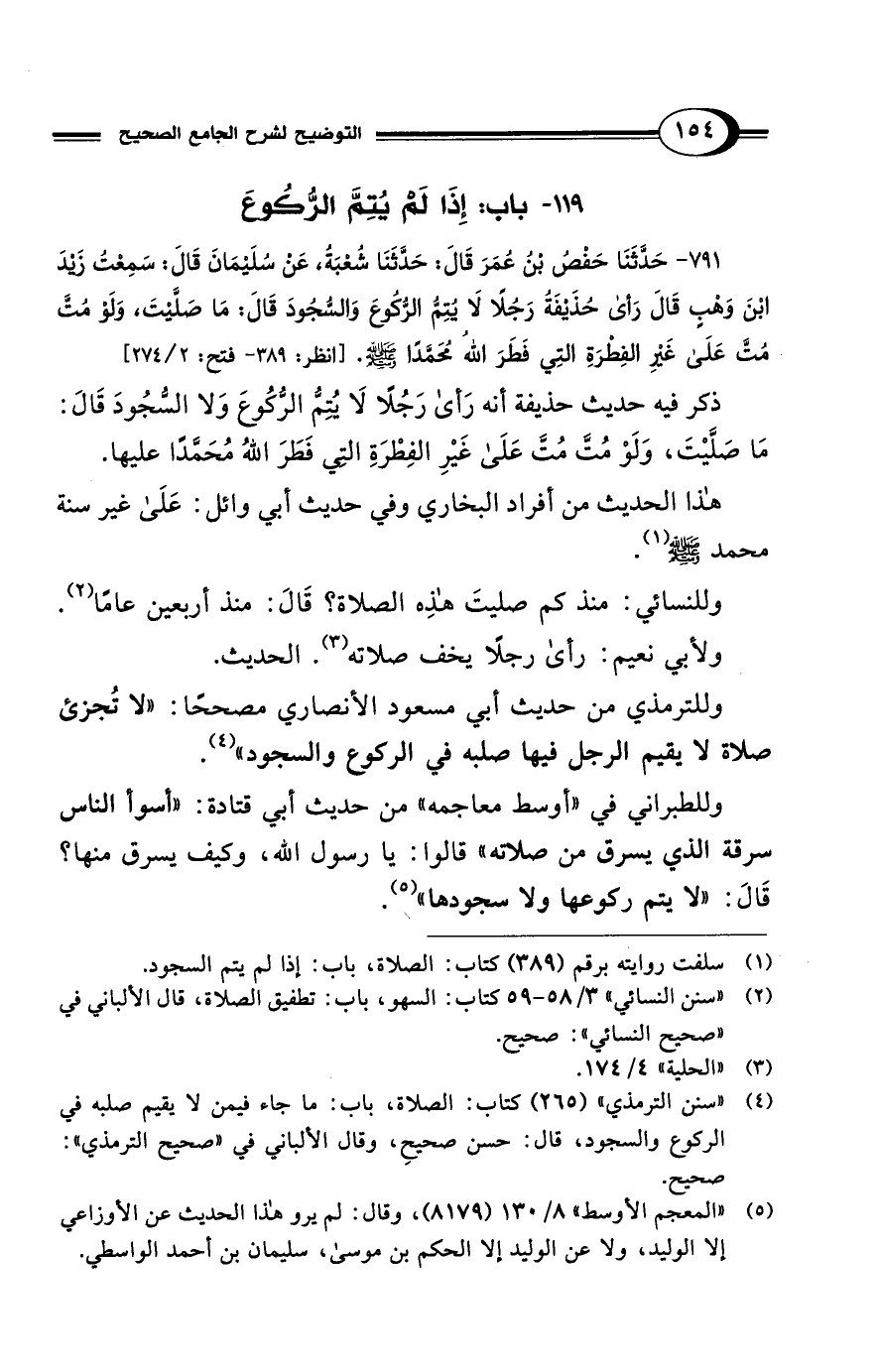 (¬4) "سنن الترمذي" (265) كتاب: الصلاة، باب: ما جاء فيمن لا يقيم صلبه في الركوع والسجود، قال: حسن صحيح، وقال الألباني في "صحيح الترمذي": صحيح.