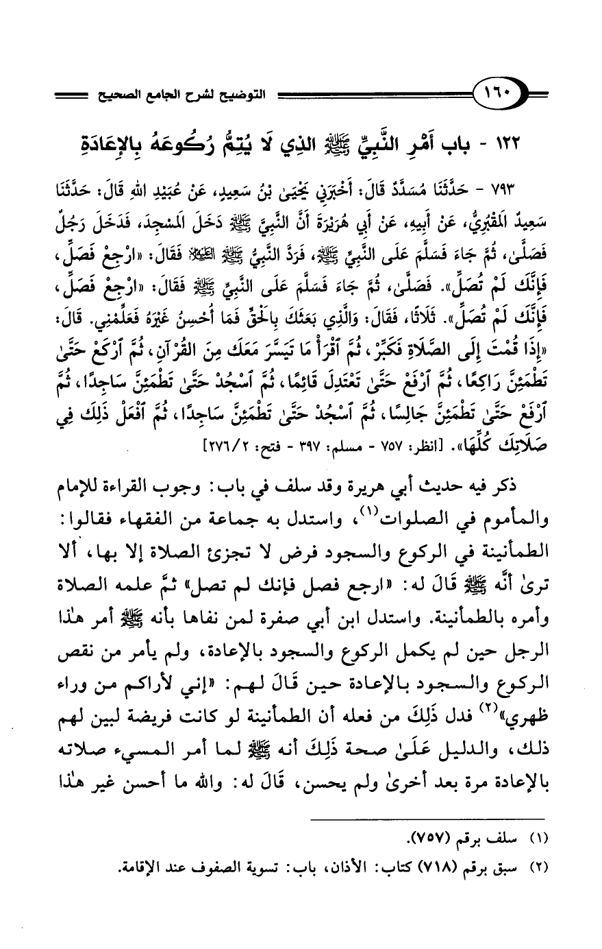 122 - باب أَمْرِ النَّبِيِّ - صلى الله عليه وسلم - الذِي لَا يُتِمُّ رُكوعَهُ بِالإِعَادَةِ