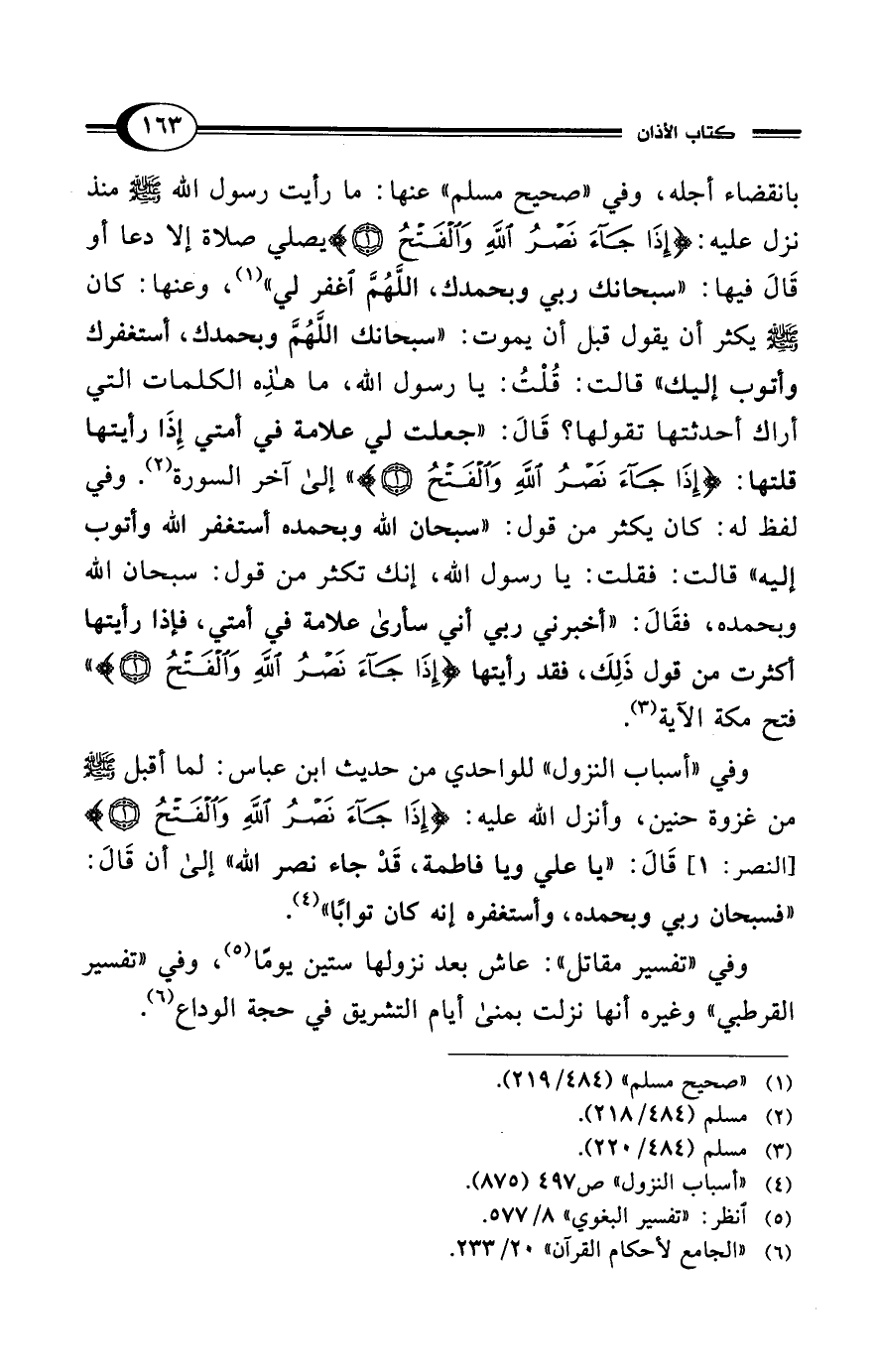 بانقضاء أجله، وفي "صحيح مسلم" عنها: ما رأيت رسول الله - صلى الله عليه وسلم - منذ نزل عليه: {إِذَا جَاءَ نَصْرُ اللَّهِ وَالْفَتْحُ (1)} يصلي صلاة إلا دعا أو قَالَ فيها: "سبحانك ربي وبحمدك، اللَّهُمَّ اغفر لي" (¬1)، وعنهما: كان - صلى الله عليه وسلم - يكثر أن يقول قبل أن يموت: "سبحانك اللَّهُمَّ وبحمدك، أستغفرك وأتوب إليك" قالت: قُلْتُ: يا رسول الله، ما هذِه الكلمات التي أراك أحدثتها تقولها؟ قَالَ: "جعلت لي علامة في أمتي إِذَا رأيتها قلتها: {إِذَا جَاءَ نَصْرُ اللَّهِ وَالْفَتْحُ (1)} إلى آخر السورة (¬2). وفي لفظ له: كان يكثر من قول: "سبحان الله وبحمده أستغفر الله وأتوب إليه" قالت: فقلت: يا رسول الله، إنك تكثر من قول: سبحان الله وبحمده، فقَالَ: "أخبرني ربي أني سأرى علامة في أمتي، فإذا رأيتها أكثرت من قول ذَلِكَ، فقد رأيتها {إِذَا جَاءَ نَصْرُ اللهِ وَالْفَتْحُ (1)} فتح مكة الآية (¬3).