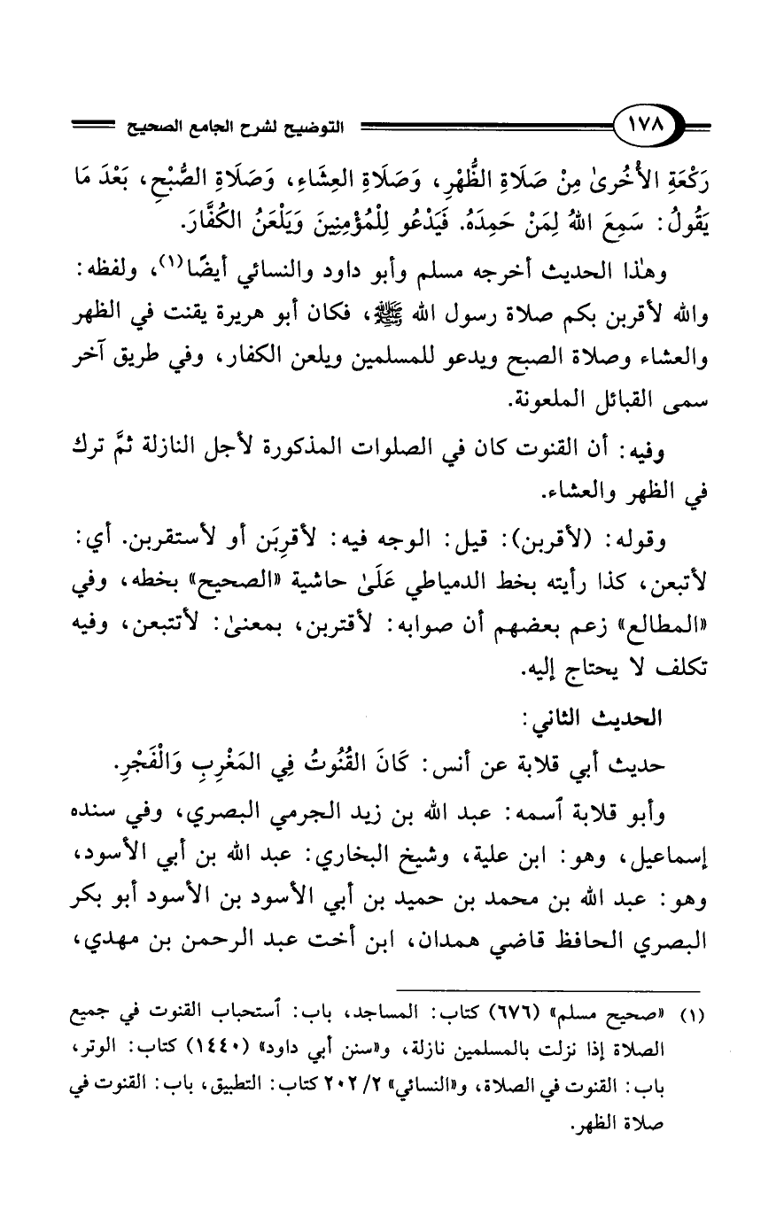 (¬1) "صحيح مسلم" (676) كتاب: المساجد، باب: استحباب القنوت في جميع الصلاة إذا نزلت بالمسلمين نازلة، و"سنن أبي داود" (1440) كتاب: الوتر، باب: القنوت في الصلاة، و"النسائي" 2/ 202 كتاب: التطبيق، باب: القنوت في صلاة الظهر.