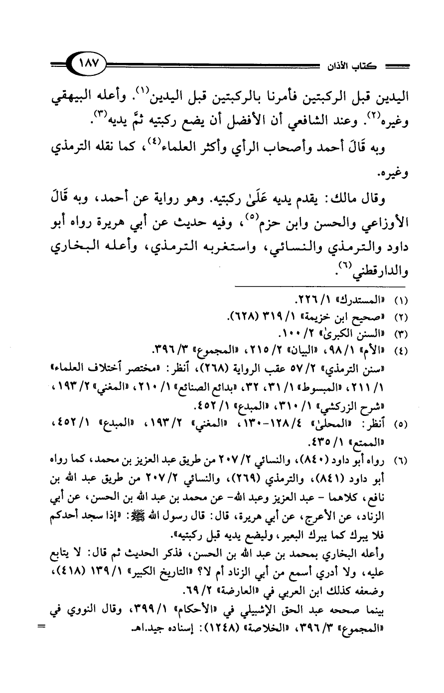 (¬6) رواه أبو داود (840)، والنسائي 2/ 207 من طريق عبد العزيز بن محمد، كما رواه أبو داود (841)، والترمذي (269)، والنسائي 2/ 207 من طريق عبد الله بن نافع، كلاهما -عبد العزيز وعبد الله- عن محمد بن عبد الله بن الحسن، عن أبي الزناد، عن الأعرج، عن أبي هريرة، قال: قال رسول الله - صلى الله عليه وسلم -: "إذا سجد أحدكم فلا يبرك كما يبرك البعير، وليضع يديه قبل ركبتيه".