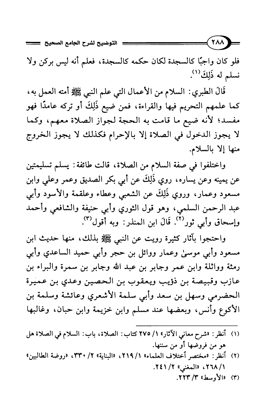 (¬1) انظر: "شرح معاني الآثار" 1/ 275 كتاب: الصلاة، باب: السلام في الصلاة هل هو من فروضها أو من سننها.