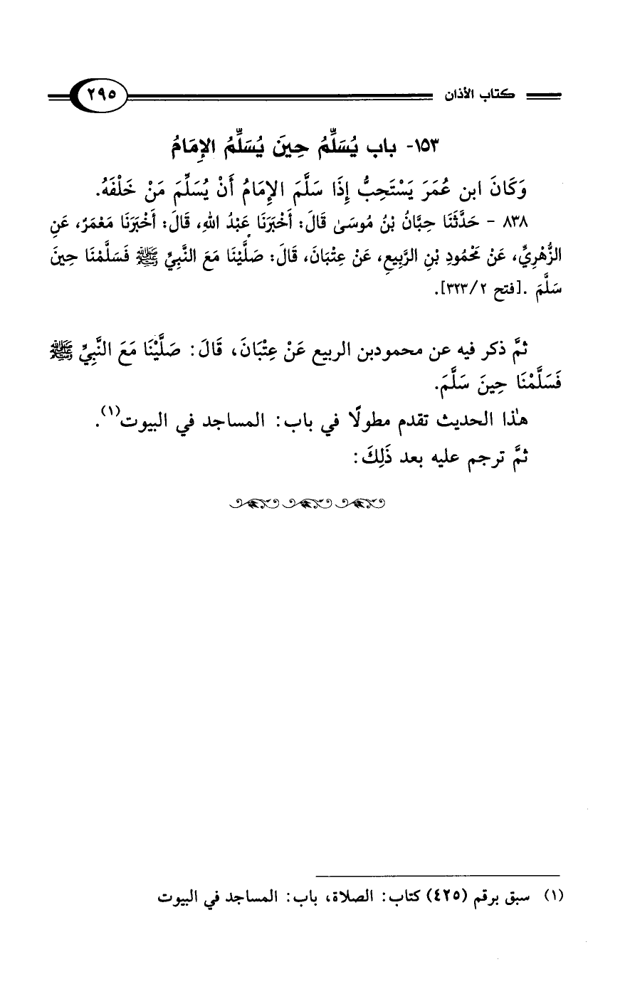 838 - حَدَّثَنَا حِبَّانُ بْنُ مُوسَى قَالَ: أَخْبَرَنَا عَبْدُ اللهِ، قَالَ: أَخْبَرَنَا مَعْمَرٌ، عَنِ الزُّهْرِيِّ، عَنْ مَحْمُودِ بْنِ الرَّبِيعِ، عَنْ عِتْبَانَ، قَالَ: صَلَّيْنَا مَعَ النَّبِيِّ - صلى الله عليه وسلم - فَسَلَّمْنَا حِينَ سَلَّمَ. [فتح 2/ 323].