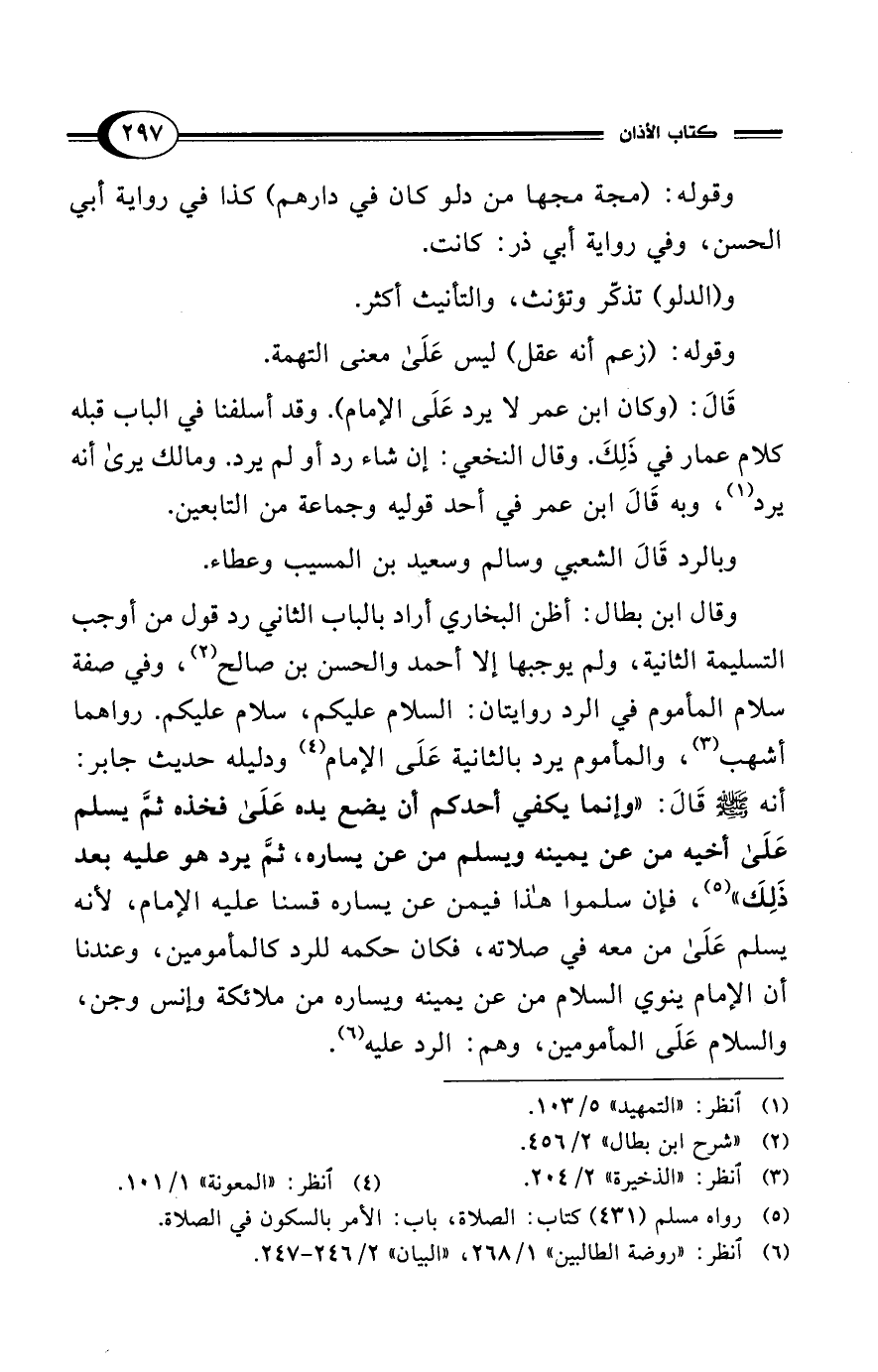 وقال ابن بطال: أظن البخاري أراد بالباب الثاني رد قول من أوجب التسليمة الثانية، ولم يوجبها إلا أحمد والحسن بن صالح (¬2)، وفي صفة سلام المأموم في الرد روايتان: السلام عليكم، سلام عليكم. رواهما أشهب (¬3)، والمأموم يرد بالثانية عَلَى الإمام (¬4) ودليله حديث جابر: أنه - صلى الله عليه وسلم - قَالَ: "وإنما يكفي أحدكم أن يضع يده عَلَى فخذه ثمَّ يسلم عَلَى أخيه من عن يمينه ويسلم من عن يساره، ثمَّ يرد هو عليه بعد ذَلِكَ" (¬5)، فإن سلموا هذا فيمن عن يساره قسنا عليه الإمام؛ لأنه يسلم عَلَى من معه في صلاته، فكان حكمه للرد كالمأمومين، وعندنا أن الإمام ينوي السلام من عن يمينه ويساره من ملائكة وإنس وجن، والسلام عَلَى المأمومين، وهم: الرد عليه (¬6).