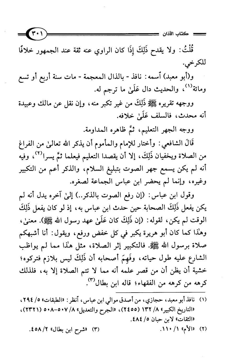 وقول ابن عباس: (إن رفع الصوت بالذكر ..) إلى آخره يدل أنه لم يكن يفعل ذَلِكَ الصحابة حين حدث ابن عباس به، إذ لو كان يفعل ذَلِكَ الوقت لم يكن، لقوله: (إن ذَلِكَ كان عَلَى عهد رسول الله - صلى الله عليه وسلم -). معنى، وهذا كما كان أبو هريرة يكبر في كل خفض ورفع، ويقول: أنا أشبهكم صلاة برسول الله - صلى الله عليه وسلم -. فالتكبير إثر الصلاة، مثل هذا مما لم يواظب الشارع عليه طول حياته، وفَهِمَ أصحابه أن ذَلِكَ ليس بلازم فتركوه؛ خشية أن يظن أن من قصر علمه أنه مما لا تتم الصلاة إلا به، فلذلك كرهه من كرهه من الفقهاء؛ قاله ابن بطال (¬3).