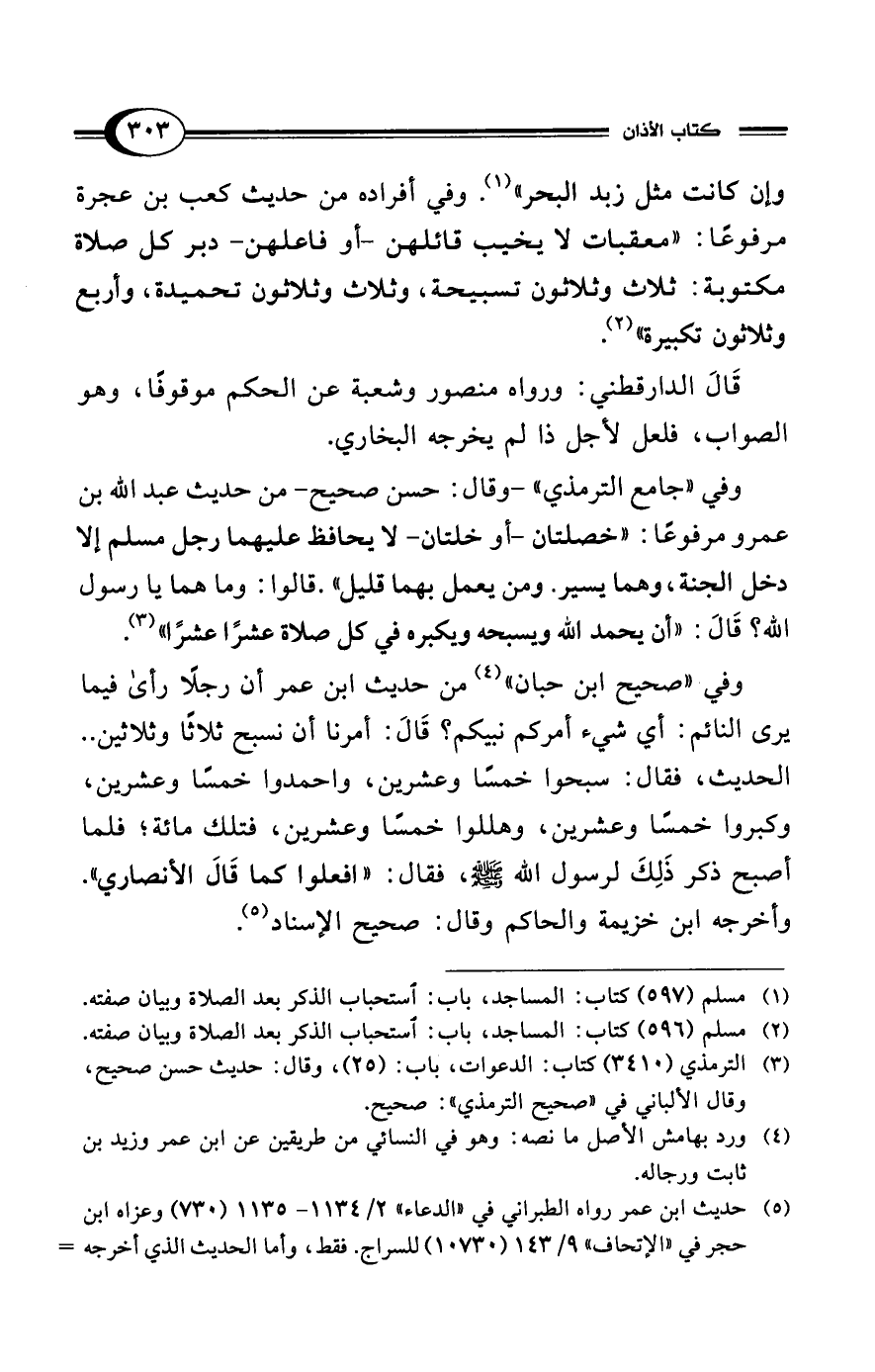 وإن كانت مثل زبد البحر" (¬1). وفي أفراده من حديث كعب بن عجرة مرفوعًا: "معقبات لا يخيب قائلهن -أو فاعلهن- دبر كل صلاة مكتوبة: ثلاث وثلاثون تسبيحة، وثلاث وثلاثون تحميدة، وأربع وثلاثون تكبيرة" (¬2).