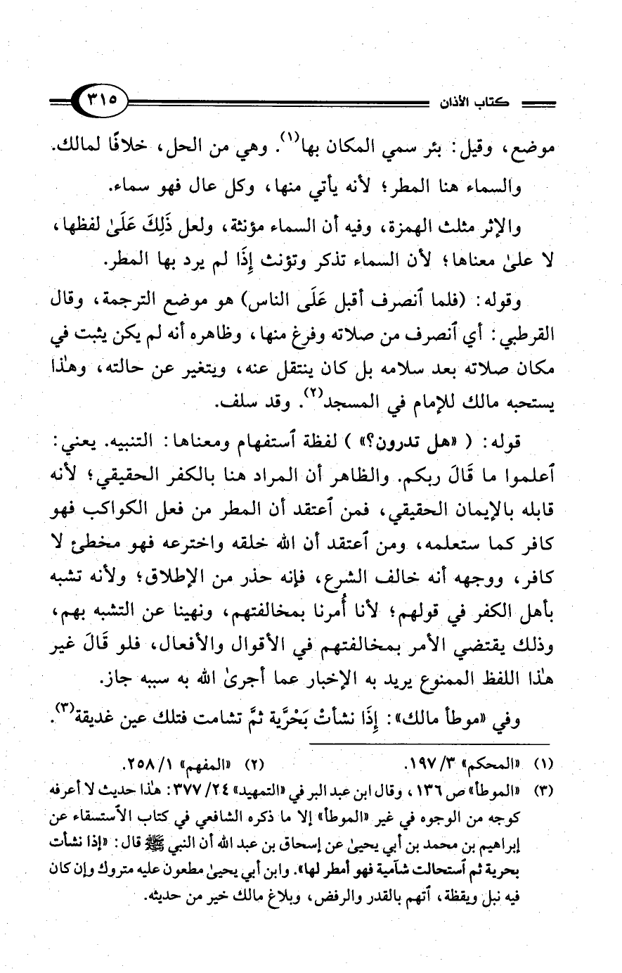 (¬3) "الموطأ" ص 136، وقال ابن عبد البر في "التمهيد" 24/ 377: هذا حديث لا أعرفه كوجه من الوجوه في غير "الموطأ" إلا ما ذكره الشافعي في كتاب الاستسقاء عن إبراهيم بن محمد بن أبي يحيى عن إسحاق بن عبد الله أن النبي - صلى الله عليه وسلم - قال: "إذا نشأت بحرية ثم استحالت شآمية فهو أمطر لها". وابن أبي يحيى مطعون عليه متروك وإن كان فيه نبل ويقظة، اتهم بالقدر والرفض، وبلاغ مالك خير من حديثه.