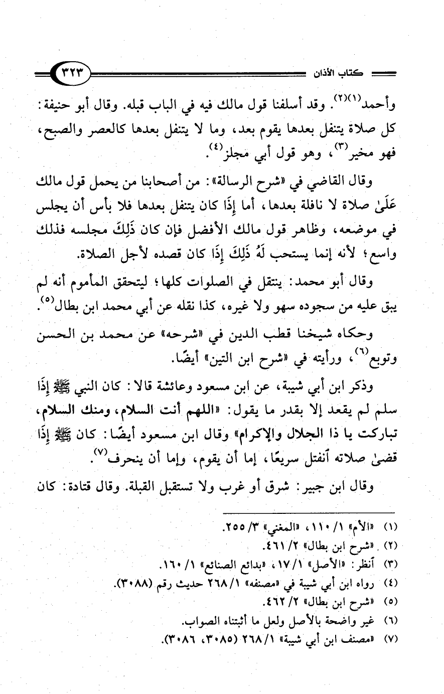 وذكر ابن أبي شيبة، عن ابن مسعود وعائشة قالا: كان النبي - صلى الله عليه وسلم - إِذَا سلم لم يقعد إلا بقدر ما يقول: "اللهم أنت السلام، ومنك السلام، تباركت يا ذا الجلال والإكرام" وقال ابن مسعود أيضًا: كان - صلى الله عليه وسلم - إذا قضى صلاته انفتل سريعًا، إما أن يقوم، وإما أن ينحرف (¬7).