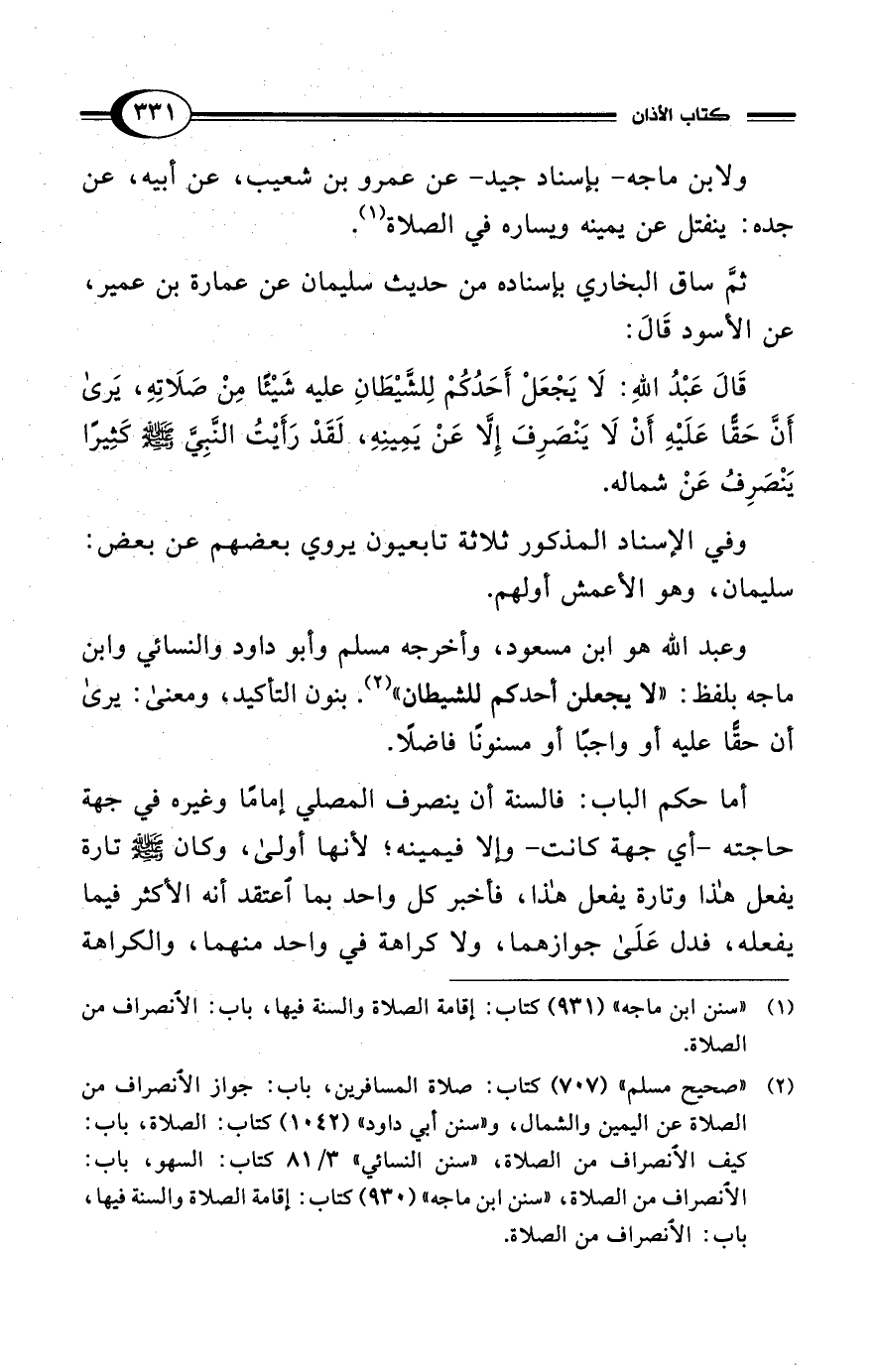 (¬2) "صحيح مسلم" (707) كتاب: صلاة المسافرين، باب: جواز الانصراف من الصلاة عن اليمين والشمال، و"سنن أبي داود" (1042) كتاب: الصلاة، باب: كيف الانصراف من الصلاة، "سنن النسائي" 3/ 81 كتاب: السهو، باب: الانصراف من الصلاة، "سنن ابن ماجه" (930) كتاب: إقامة الصلاة والسنة فيها، باب: الانصراف من الصلاة.