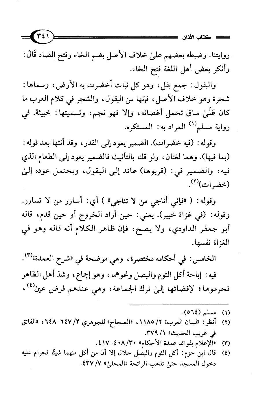 (¬4) قال ابن حزم: أكل الثوم والبصل حلال إلا أن من أكل منهما شيئًا فحرام عليه دخول المسجد حتى تذهب الرائحة "المحلى" 7/ 437.