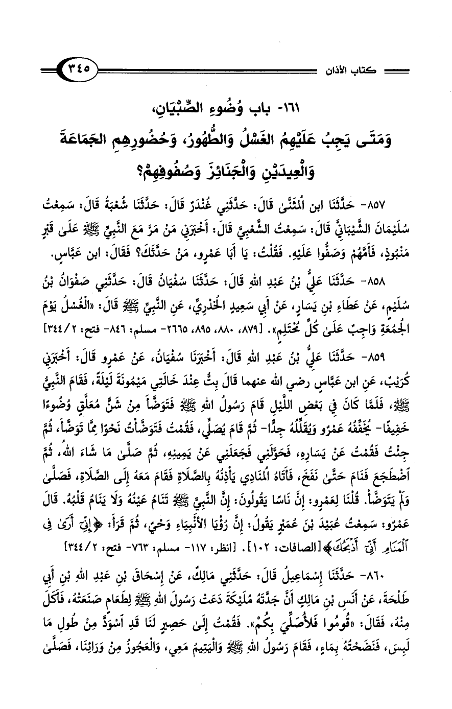 161 - باب وُضُوءِ الصِّبْيَانِ، وَمَتَى يَجِبُ عَلَيْهِمُ الغَسْلُ وَالطُّهُورُ، وَحُضُورِهِم الجَمَاعَةَ