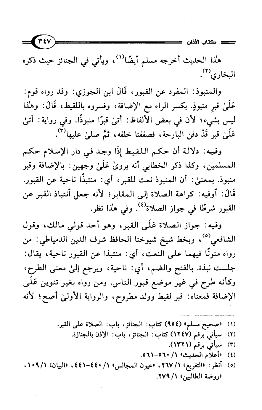 وفيه: دلالة أن حكم اللقيط إِذَا وجد في دار الإِسلام حكم المسلمين، وكذا ذكر الخطابي أنه يروى عَلَى وجهين: بالإضافة وقبر منبوذ. بمعنى: أن المنبوذ نعت للقبر، أي: منتبذًا ناحية عن القبور. قَالَ: اوفيه: كراهة الصلاة إلى المقابر؛ لأنه جعل انتباذ القبر عن القبور شرطًا في جواز الصلاة (¬4). وفي هذا نظر.