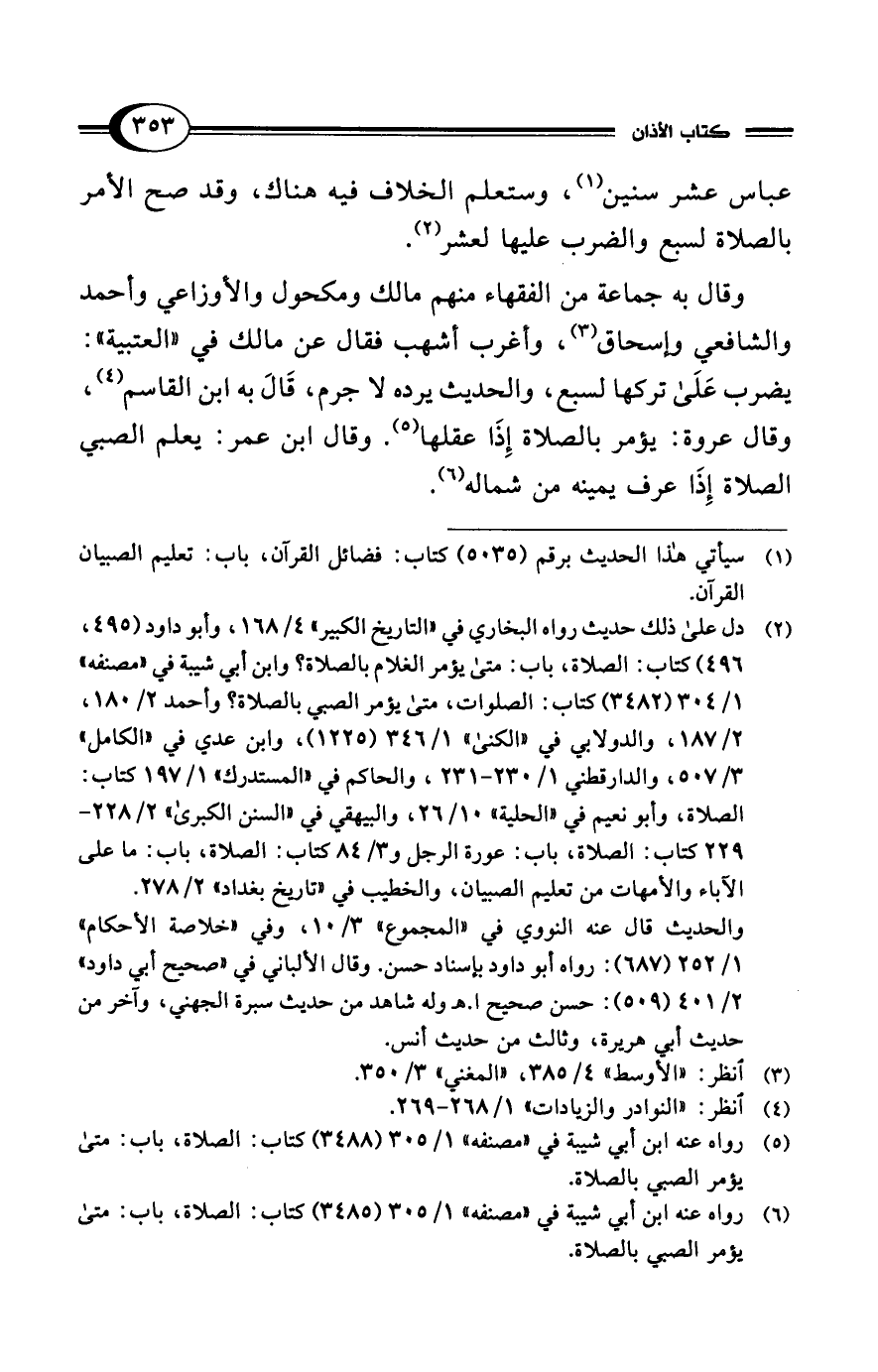 (¬2) دل على ذلك حديث رواه البخاري في "التاريخ الكبير" 4/ 168، وأبو داود (495، 496) كتاب: الصلاة، باب: متى يؤمر الغلام بالصلاة؟ وابن أبي شيبة في "مصنفه" 1/ 304 (3482) كتاب: الصلوات، متى يؤمر الصبي بالصلاة؟ وأحمد 2/ 180، 2/ 187، والدولابي في "الكنى" 1/ 346 (1225)، وابن عدي في "الكامل" 3/ 507، والدارقطني 1/ 230 - 231، والحاكم في "المستدرك" 1/ 197 كتاب: الصلاة، وأبو نعيم في "الحلية" 10/ 26، والبيهقي في "السنن الكبرى" 2/ 228 - 229 كتاب: الصلاة، باب: عورة الرجل و 3/ 84 كتاب: الصلاة، باب: ما على الآباء والأمهات من تعليم الصبيان، والخطيب في "تاريخ بغداد" 2/ 278.