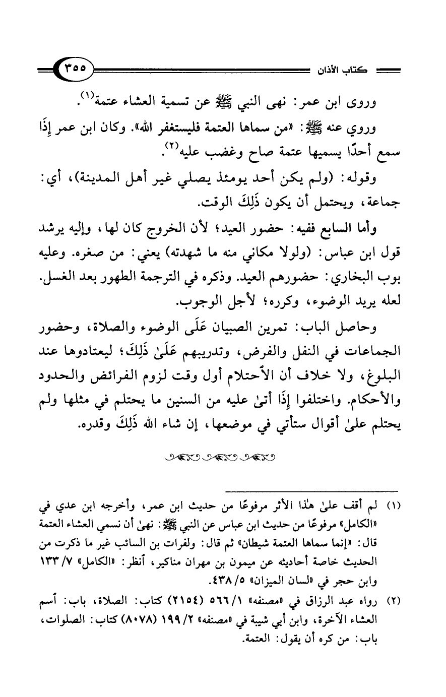 (¬2) رواه عبد الرزاق في "مصنفه" 1/ 566 (2154) كتاب: الصلاة، باب: اسم العشاء الآخرة، وابن أبي شيبة في "مصنفه" 2/ 199 (8078) كتاب: الصلوات، باب: من كره أن يقول: العتمة.
