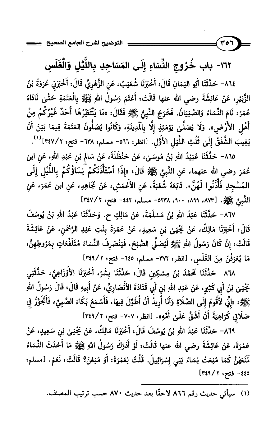 162 - باب خُرُوجِ النِّسَاءِ إِلَى المَسَاجِدِ بِاللَّيْلِ وَالغَلَسِ