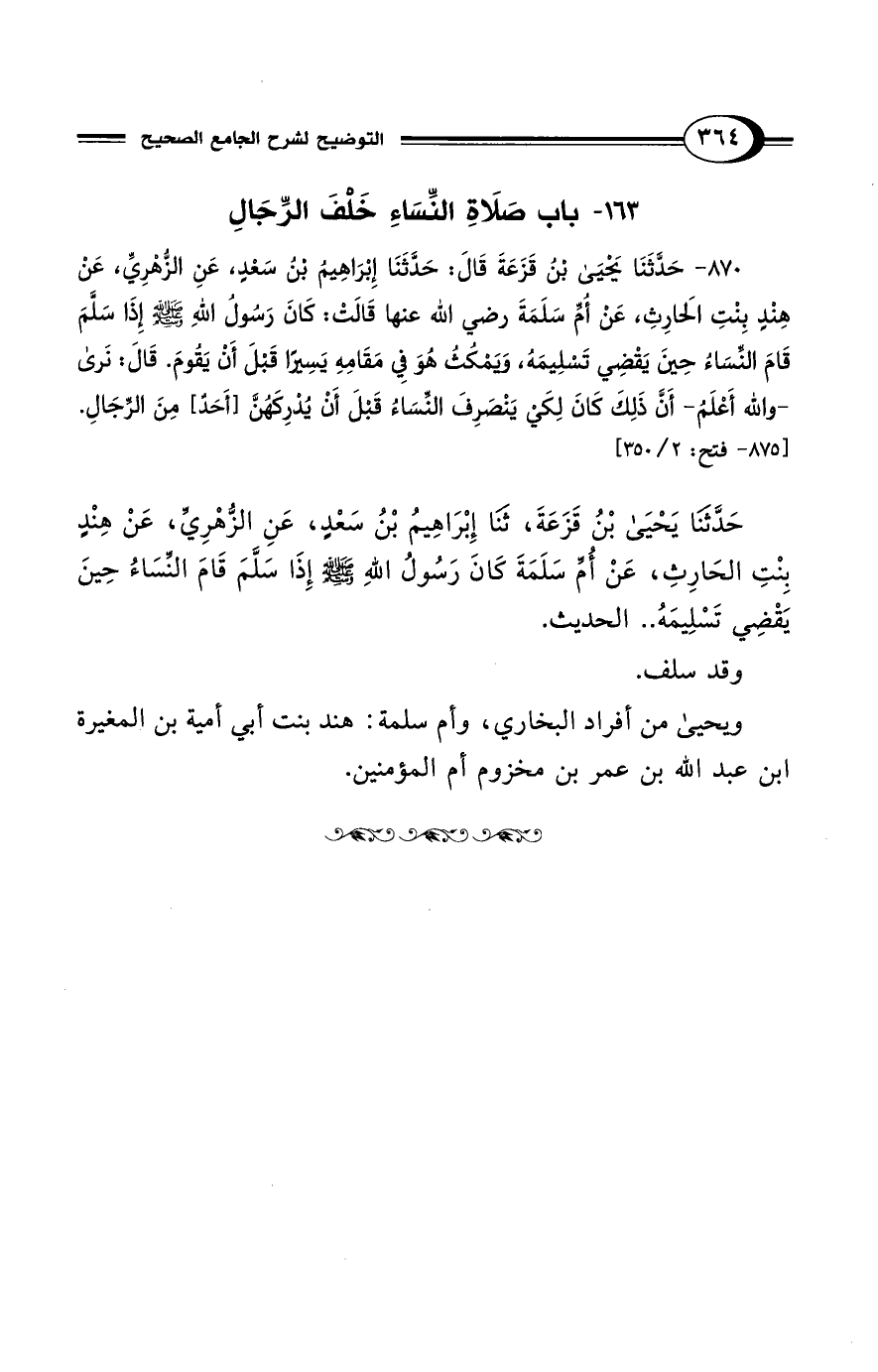870 - حَدَّثَنَا يَحْيَى بْنُ قَزَعَةَ قَالَ: حَدَّثَنَا إِبْرَاهِيمُ بْنُ سَعْدٍ، عَنِ الزُّهْرِيِّ، عَنْ هِنْدٍ بِنْتِ الحَارِثِ، عَنْ أُمِّ سَلَمَةَ رضي الله عنها قَالَتْ: كَانَ رَسُولُ اللهِ - صلى الله عليه وسلم - إِذَا سَلَّمَ قَامَ النِّسَاءُ حِينَ يَقْضِي تَسْلِيمَهُ، وَيَمْكُثُ هُوَ فِي مَقَامِهِ يَسِيرًا قَبْلَ أَنْ يَقُومَ. قَالَ: نَرَى -وَاللهُ أَعْلَمُ- أَنَّ ذَلِكَ كَانَ لِكَيْ يَنْصَرِفَ النِّسَاءُ قَبْلَ أَنْ يُدْرِكَهُنَّ [أَحَدٌ] مِنَ الرِّجَالِ. [875 - فتح: 2/ 350]