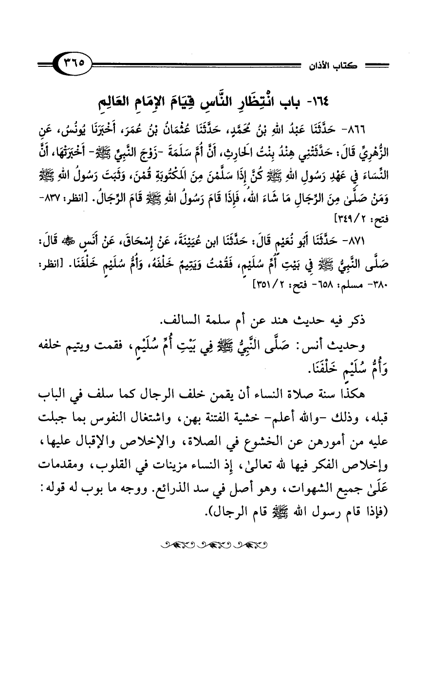 866 - حَدَّثَنَا عَبْدُ اللهِ بْنُ مُحَمَّدٍ، حَدَّثَنَا عُثْمَانُ بْنُ عُمَرَ، أَخْبَرَنَا يُونُسُ، عَنِ الزُّهْرِيِّ قَالَ: حَدَّثَتْنِى هِنْدُ بِنْتُ الحَارِثِ، أَنَّ أُمَّ سَلَمَةَ -زَوْجَ النَّبِيِّ - صلى الله عليه وسلم -- أَخْبَرَتْهَا، أَنَّ النِّسَاءَ فِي عَهْدِ رَسُولِ اللهِ - صلى الله عليه وسلم - كُنَّ إِذَا سَلَّمْنَ مِنَ المَكْتُوبَةِ قُمْنَ، وَثَبَتَ رَسُولُ اللهِ - صلى الله عليه وسلم - وَمَنْ صَلَّى مِنَ الرِّجَالِ مَا شَاءَ اللهُ، فَإِذَا قَامَ رَسُولُ اللهِ - صلى الله عليه وسلم - قَامَ الرِّجَالُ. [انظر: 837 - فتح: 2/ 349]