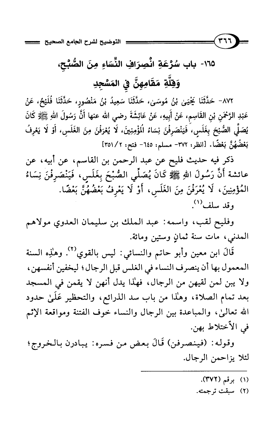 قَالَ ابن معين وأبو حاتم والنسائي: ليس بالقوي (¬2). وهذِه السنة المعمول بها أن ينصرف النساء في الغلس قبل الرجال؛ ليخفين أنفسهن، ولا يبن لمن لقيهن من الرجال، فهذا يدل أنهن لا يقمن في المسجد بعد تمام الصلاة، وهذا من باب سد الذرائع، والتحظير عَلَى حدود الله تعالى، والمباعدة بين الرجال والنساء خوف الفتنة ومواقعة الإثم في الاختلاط بهن.