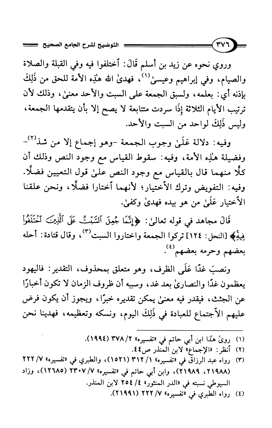 قَالَ مجاهد في قوله تعالى: {إِنَّمَا جُعِلَ السَّبْتُ عَلَى الَّذِينَ اخْتَلَفُوا فِيهِ} [النحل: 124] تركوا الجمعة واختاروا السبت (¬3)، وقال قتادة: أحله بعضهم وحرمه بعضهم (¬4).