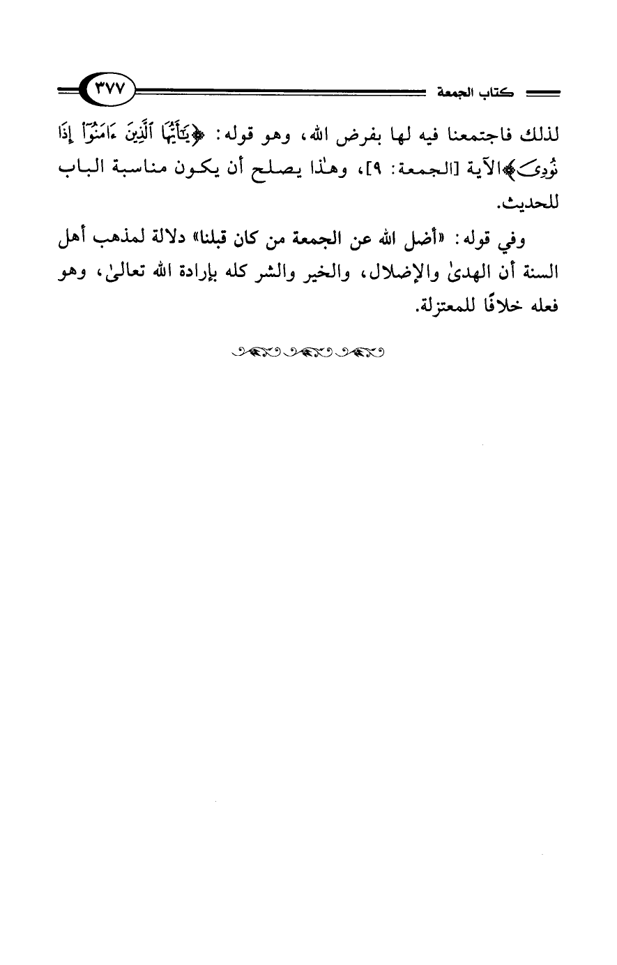 وفي قوله: "أضل الله عن الجمعة من كان قبلنا" دلالة لمذهب أهل السنة أن الهدى والإضلال، والخير والشر كله بإرادة الله تعالى، وهو فعله خلافًا للمعتزلة.