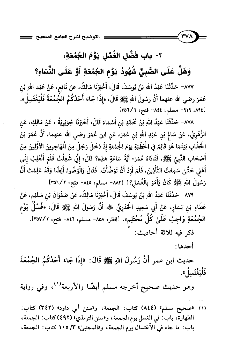 878 - حَدَّثَنَا عَبْدُ اللهِ بْنُ مُحَمَّدِ بْنِ أَسْمَاءَ قَالَ: أَخْبَرَنَا جُوَيْرِيَةُ، عَنْ مَالِكٍ، عَنِ الزُّهْرِيِّ، عَنْ سَالِمِ بْنِ عَبْدِ اللهِ بْنِ عُمَرَ، عَنِ ابْنِ عُمَرَ رضي الله عنهما، أَنَّ عُمَرَ بْنَ الخَطَّابِ بَيْنَمَا هُوَ قَائِمٌ فِي الخُطْبَةِ يَوْمَ الجُمُعَةِ إِذْ دَخَلَ رَجُلٌ مِنَ المُهَاجِرِينَ الأَوَّلِينَ مِنْ أَصْحَابِ النَّبِيِّ - صلى الله عليه وسلم -، فَنَادَاهُ عُمَرُ: أَيَّةُ سَاعَةٍ هَذِهِ؟ قَالَ: إِنِّي شُغِلْتُ فَلَمْ أَنْقَلِبْ إِلَى أَهْلِي حَتَّى سَمِعْتُ التَّأْذِينَ، فَلَمْ أَزِدْ أَنْ تَوَضَّأْتُ. فَقَالَ وَالوُضُوءُ أَيْضًا وَقَدْ عَلِمْتَ أَنَّ رَسُولَ اللهِ - صلى الله عليه وسلم - كَانَ يَأْمُرُ بِالغُسْلِ.؟! [882 - مسلم: 845 - فتح: 2/ 356]