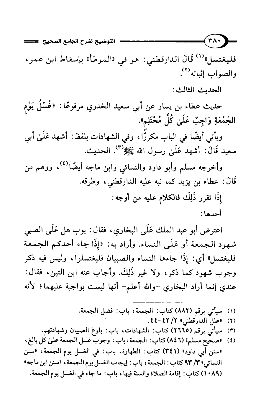 (¬4) "صحيح مسلم" (846) كتاب: الجمعة، باب: وجوب غسل الجمعة على كل بالغ، "سنن أبي داود" (341) كتاب: الطهارة، باب: في الغسل يوم الجمعة، "سنن النسائي" 3/ 93 كتاب: الجمعة، باب: إيجاب الغسل يوم الجمعة، "سنن ابن ماجه" (1089) كتاب: إقامة الصلاة والسنة فيها، باب: ما جاء في الغسل يوم الجمعة.